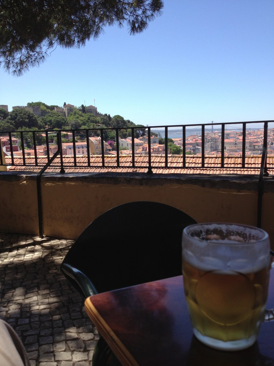 En öl utanför kyrkan Igreja da Graca med utsikt mot Castelo de S. Jorge