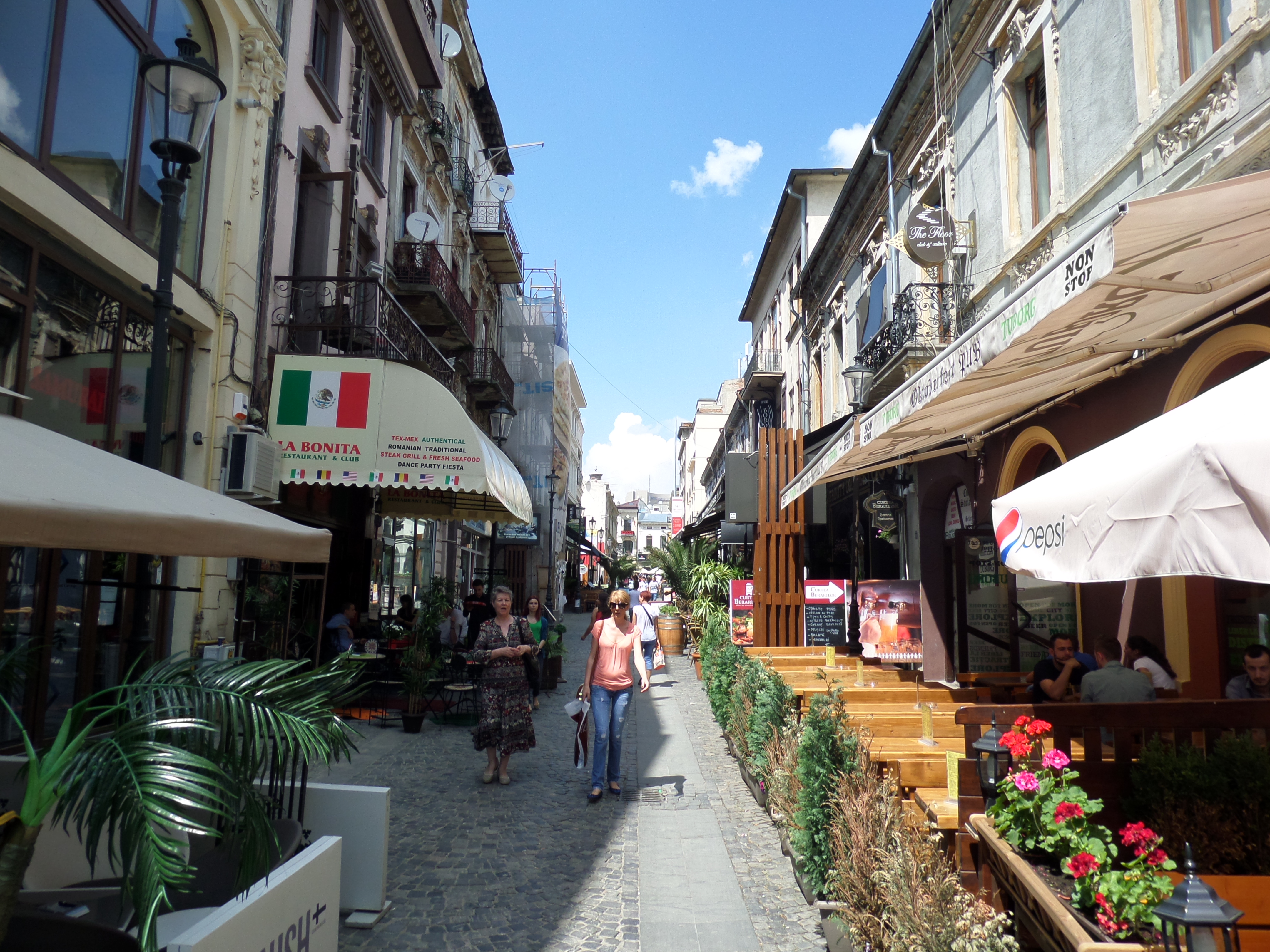 Bukarest ← Föregående Nästa → Dagtid i Gamla stan. Inte fullt lika mycket folk, men utbudet är oförändrat.