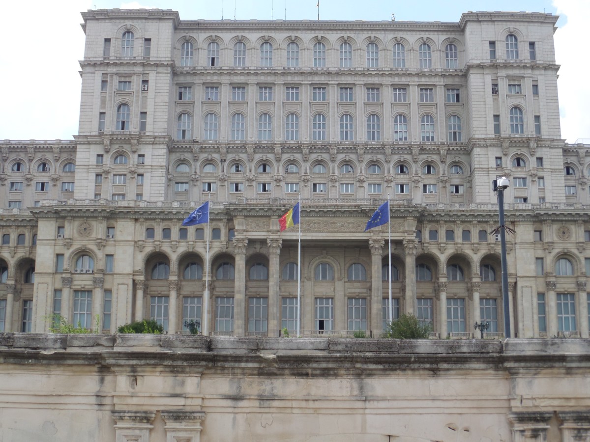 De tre flaggorna i vinden. Rumäniens, EU-, och NATO-flaggorna.