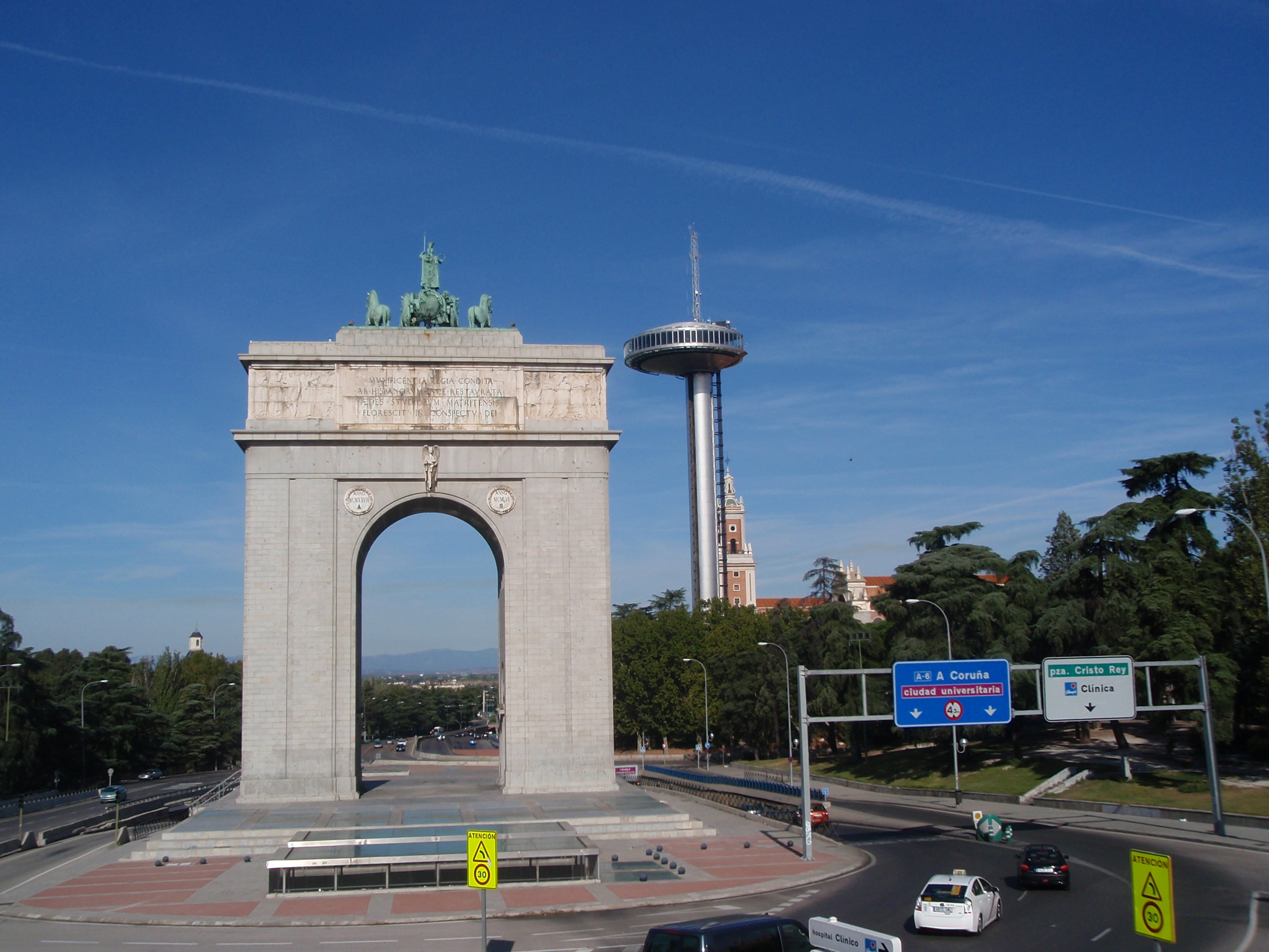 Madrid ← Föregående Nästa → I rätt vinkel kan det se ut som ett flygande tefat. Triumfbågen ser ut som en triumfbåge i alla vinklar.