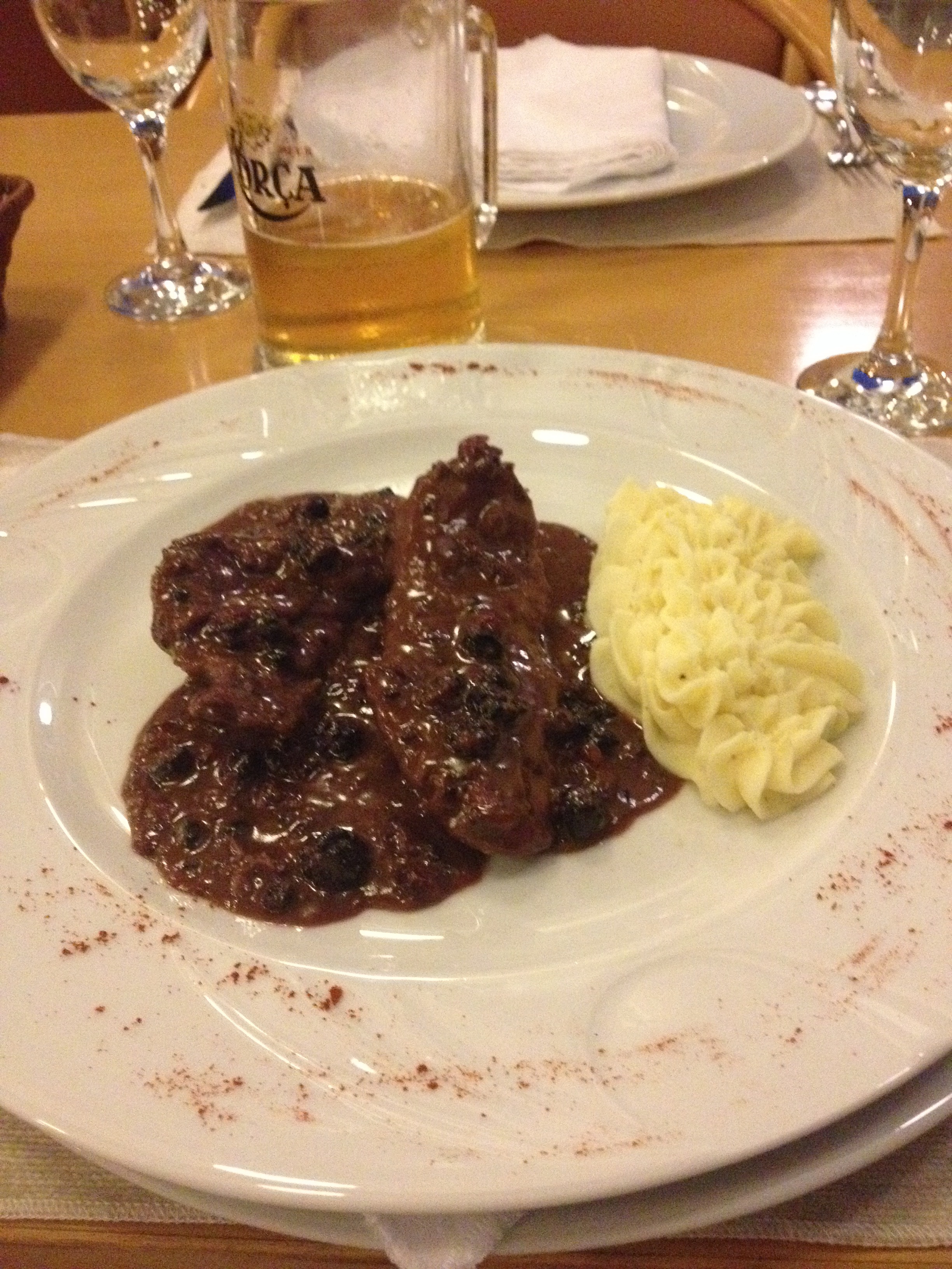 Tirana ← Föregående Nästa → Sista kvällen åts struts. Dessa filéer hade tillagats i en vinsås och serverades med skogens bär.
