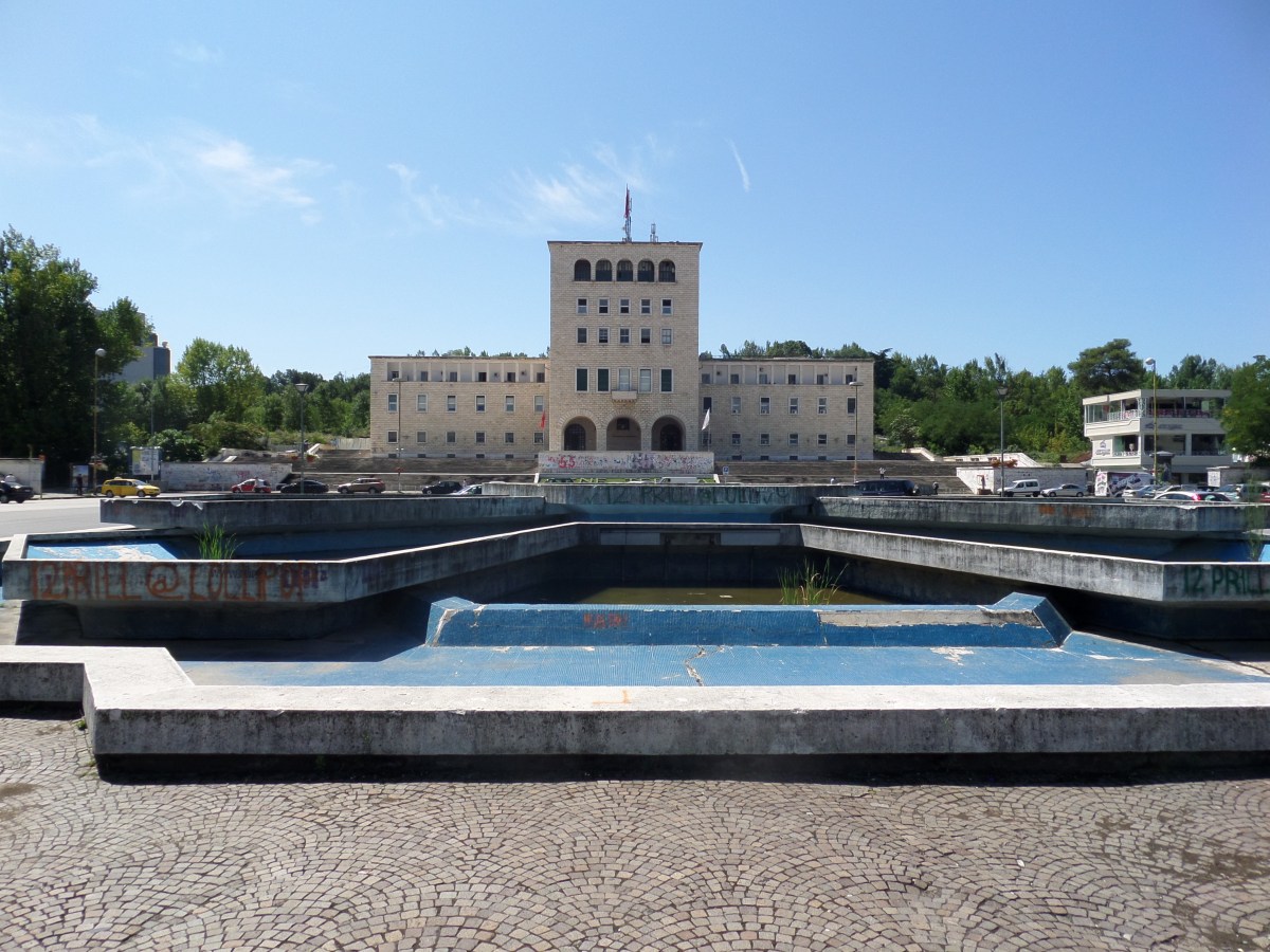 Tirana ← Föregående Nästa → Moder Teresas torg med Tekniska universitetet. Statyn på Moder Teresa står uppe vid universitetsbyggnaden