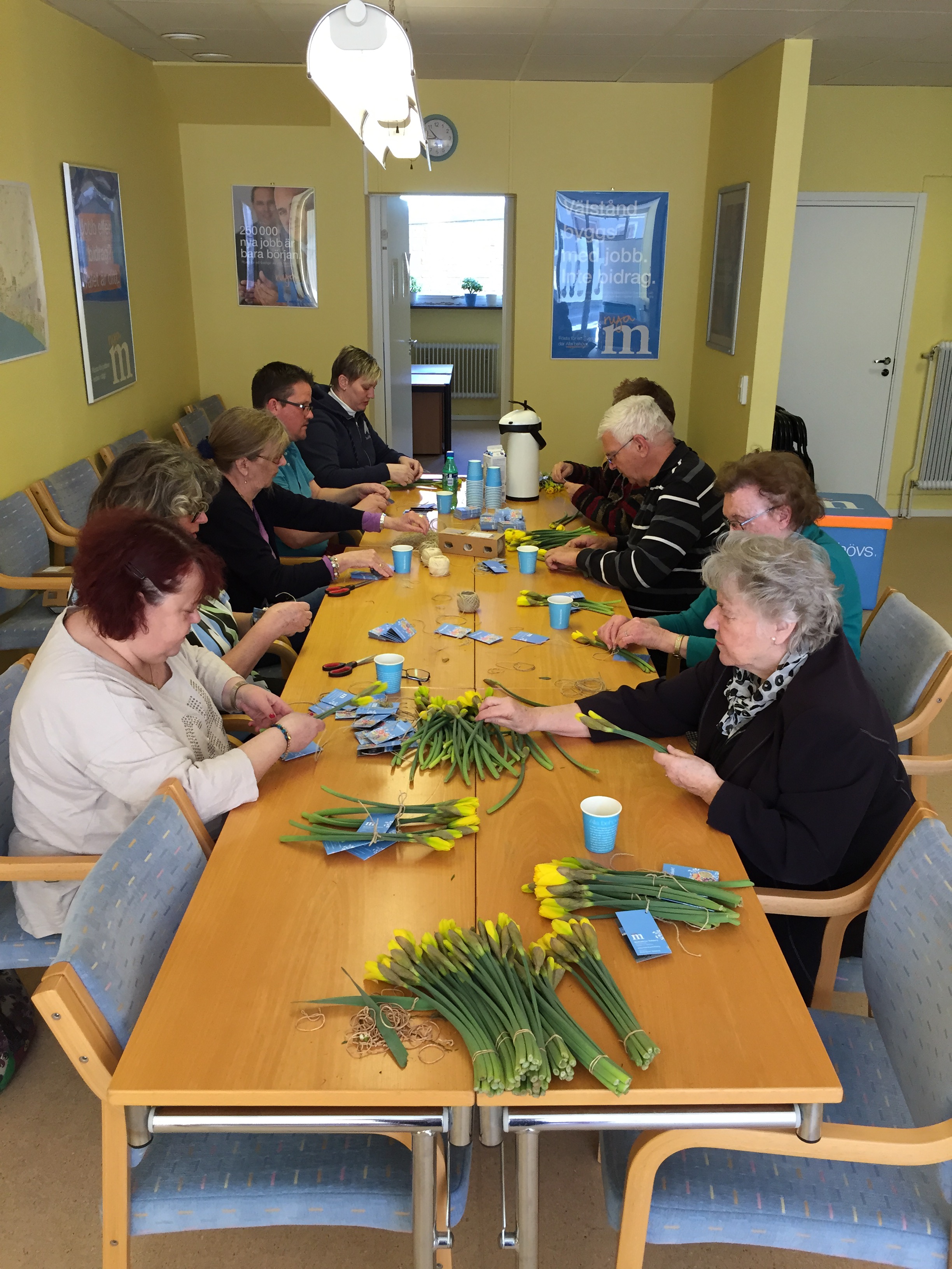 Full fart att binda buketter inför Påskliljekampanjen på Skärtorsdagen