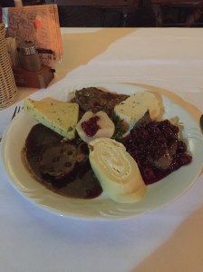 - En tallrik med lokala delikatesser. Rådjursmedaljonger med körsbärssås, kronhjortsfilé med svampsås samt vildsvin med grönpepparsås med polenta och andra tillbehör