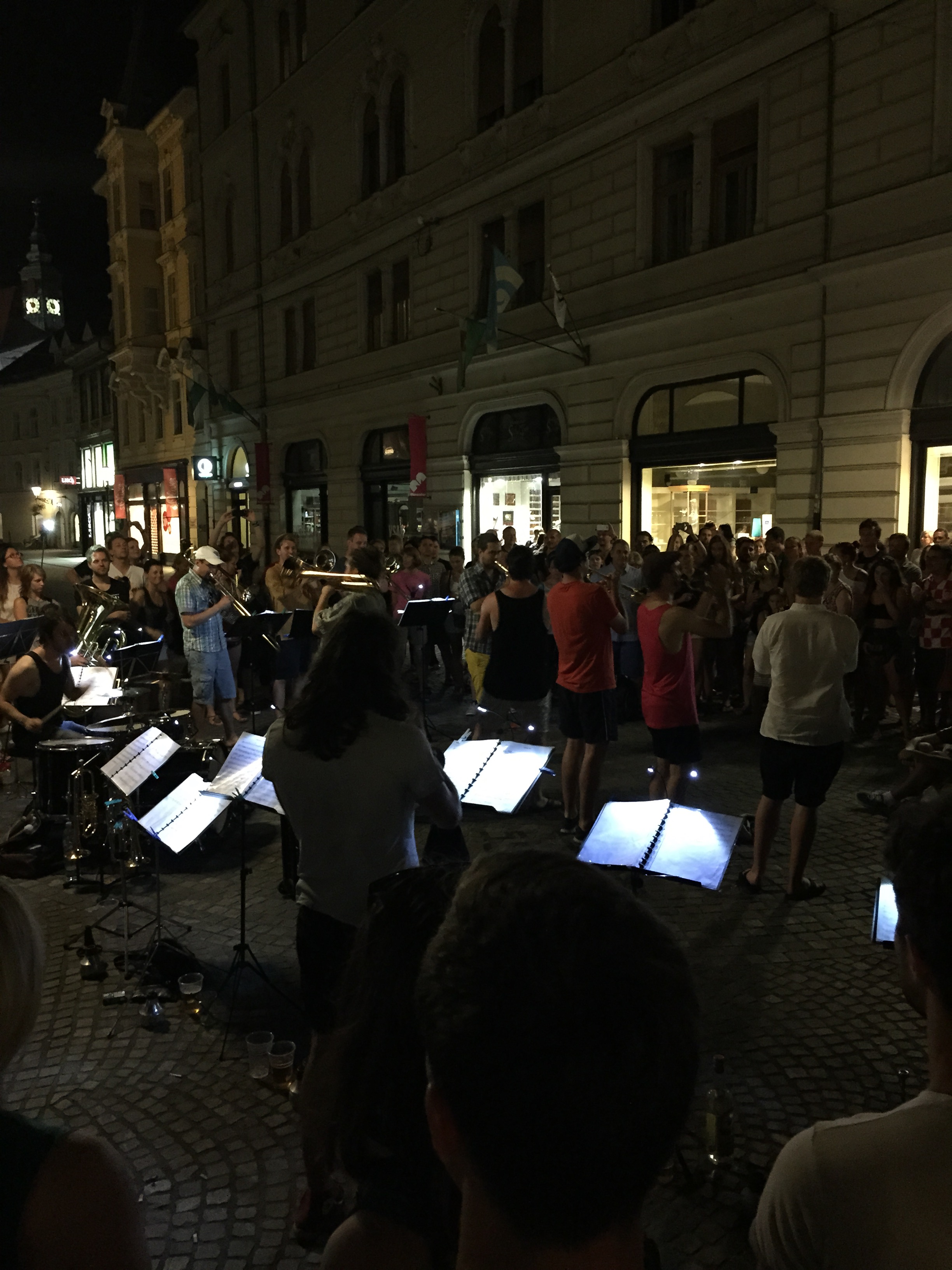 Underhållning med trumpetspel, trombon och trummor om kvällen