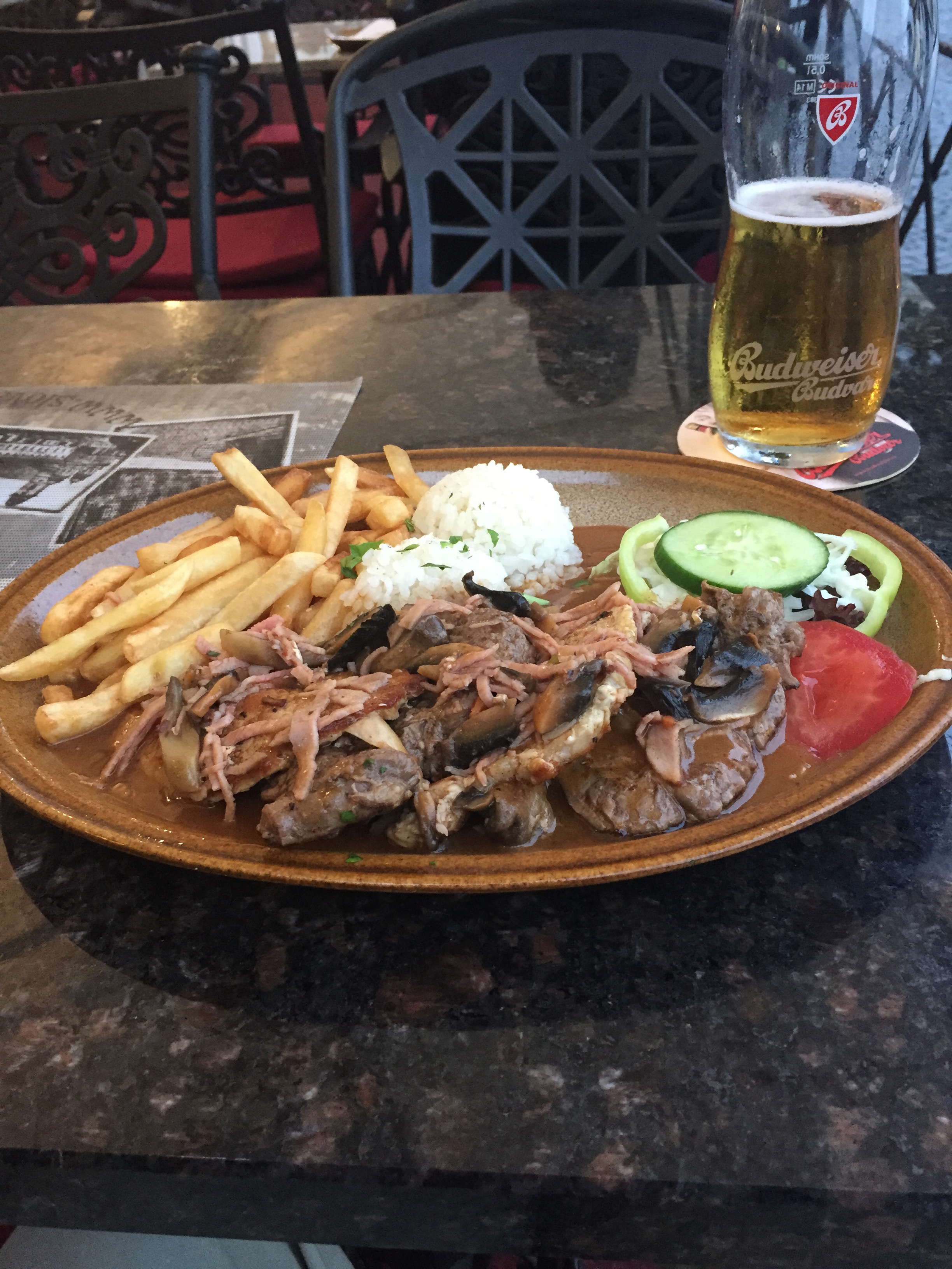 Ox- och fläskfiléer med ris och pommes.