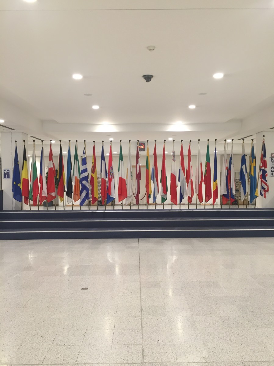 Medlemsländernas flaggor på rad i EU-parlamentet i Bryssel.