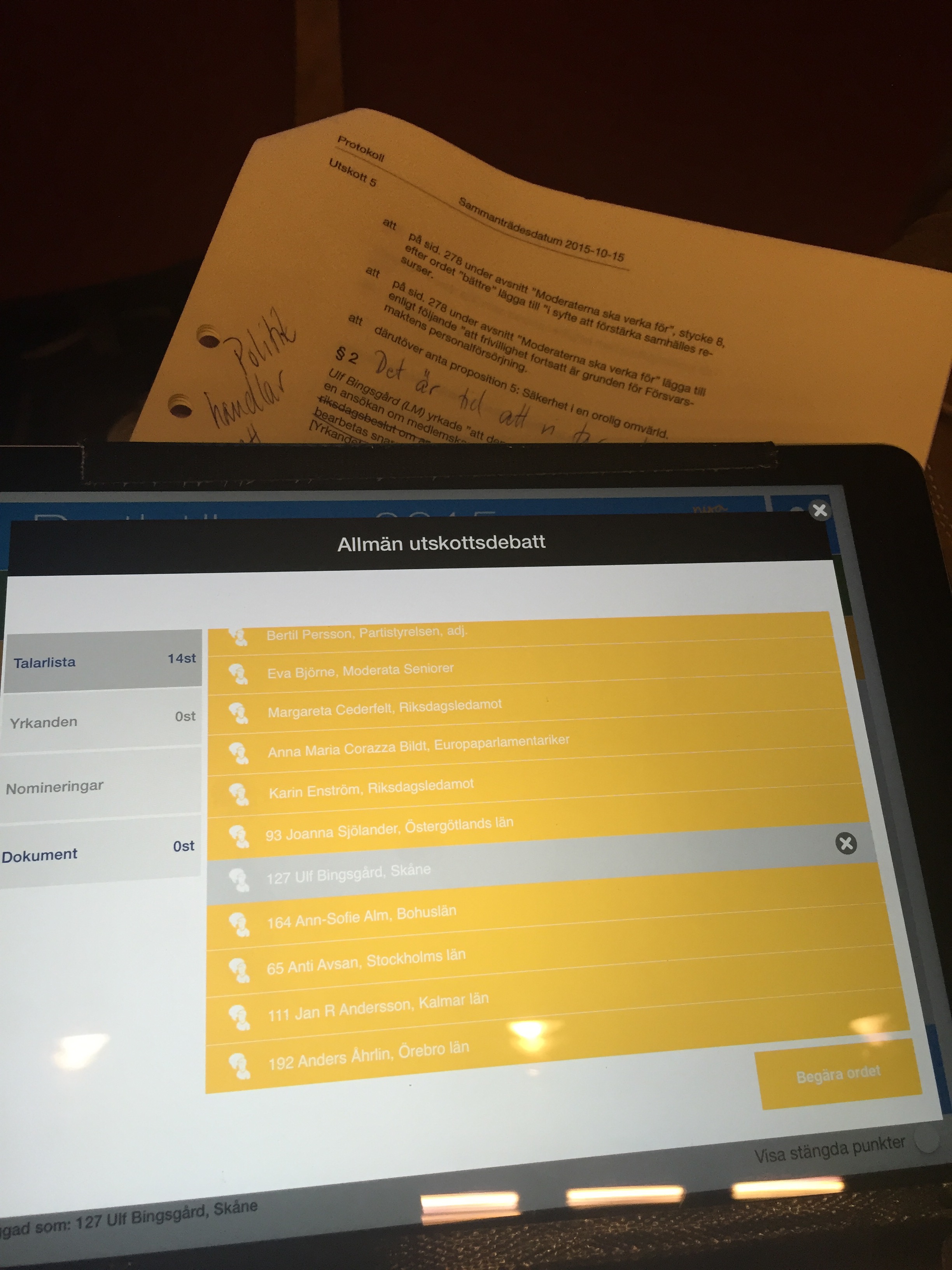 Första dagen var vikt åt utskottsbehandling. Jag hade hamnat i utskottet som skulle hantera förslagen från partistyrelsen och inkomna motioner gällande säkerhetspolitik, försvar och vår omvärld. Bland frågorna som hanterades var svenskt medlemskap i NATO.