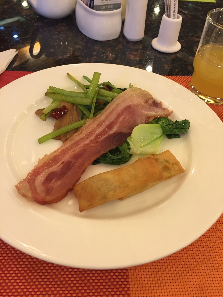 Bacon, små vårrullar och wokade grönsaker