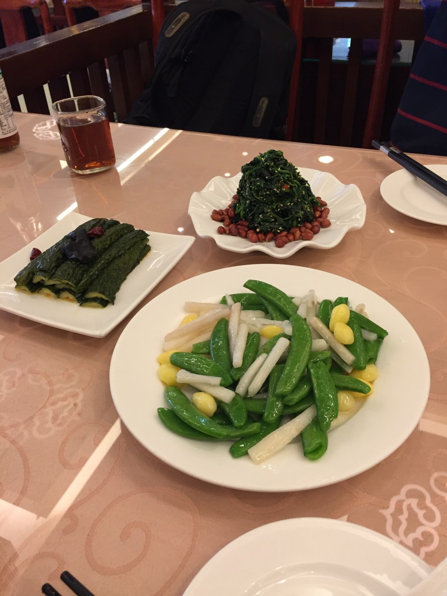Beijing ← Föregående Nästa → Färska och wokade grönsaker. Gurkor, spenat, bambu, bönor och sockerärtor.
