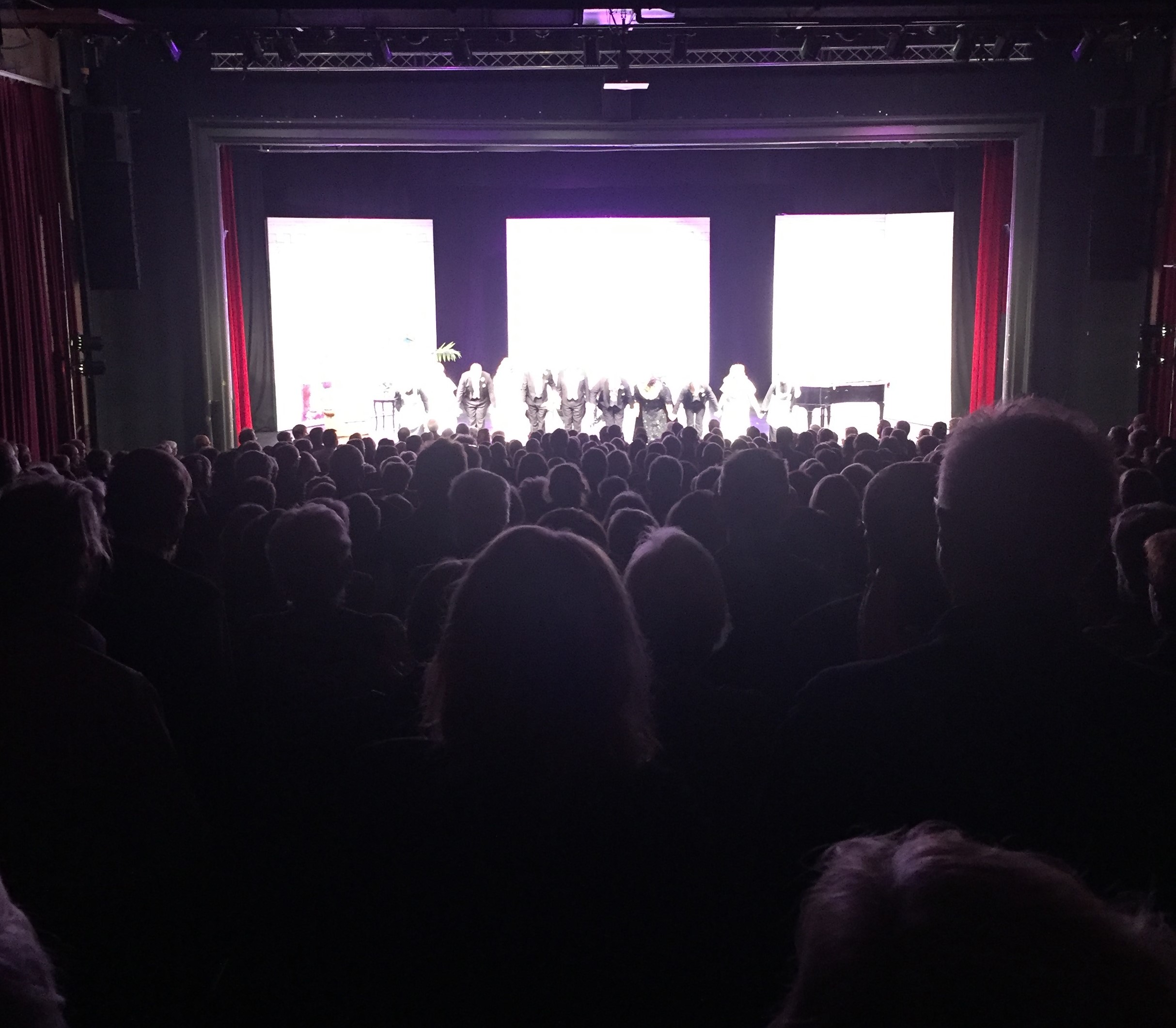 Ljudet var inte hela tiden på topp. När det sjöngs tog den inspelade musiken överhand. Detta fick till följd att sångens text inte hördes så bra och då tappades lite av berättelsen bort. På plussidan får jag framhålla att de valt en lokal som inte var för stor, utan alla kunde få närheten till scenen och därmed också se skådespelarnas ansiktsuttryck.