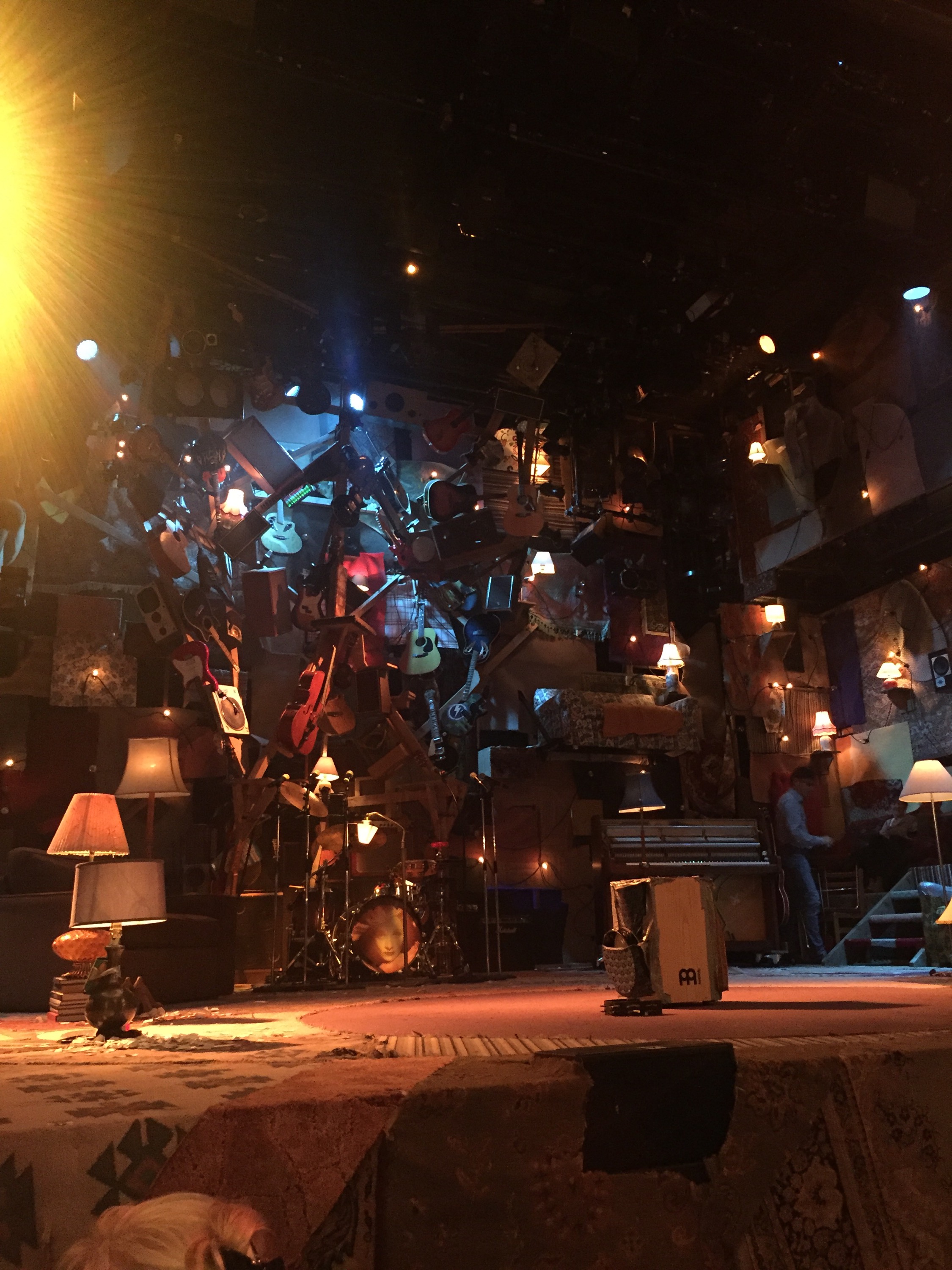Det är en fast scen genom hela föreställning. Roligt är det att vissa publikplatser är uppe på scen. En scen som består av ett virrvarr av lampor och musikinstrument utgör bakgrunden. Soffor lite här och där. Väldigt enkelt och avskalat. Mikrofonstativ, stolar och soffor flyttas runt och en rejäl ljussättning finns. Enkelt, annorlunda men passande.