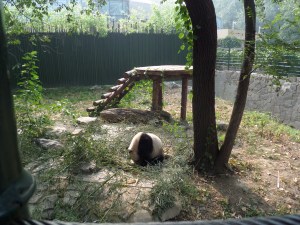 När väl jag var inne i pandaområdet så gick jag snällt den anvisade vägen. Några djur på väg dit, men området var uppbyggt som en bambuskog. När jag väl kom ut ur skogen fick jag se…. en tom uteplats för pandor. Inte ett enda tecken på levande liv. Kände viss besvikelse, men i det angränsande hägnet fanns en trött panda som mest satt och satt. Jaha? Var det detta jag rest över halva jordklotet för att se? Nåja, panda som panda. Jag tittade och fotograferade. Visst var den söt, men lite besviken kände jag mig ändå.