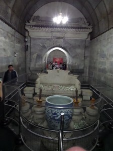 Själva gravkammaren ligger under jorden, så det var bara att bege sig ner. Imponerande var det så klart att komma fram till de stor rummen, men de var ju helt tomma på utsmyckning. Inne i själva gravkammaren kunde vi bara se stora röda lådor som fick symbolisera kejsarens och hans två kejsarinnors gravar. Min förväntning på storslagen prakt fick ersättas av viss besvikelse. Eftersom det var många turister här så var det också att hålla högt tempo och jämna steg med vår guide. Hennes berättelse var nog mer målande än vad enbart man kunde föreställa sin av det som fanns kvar.