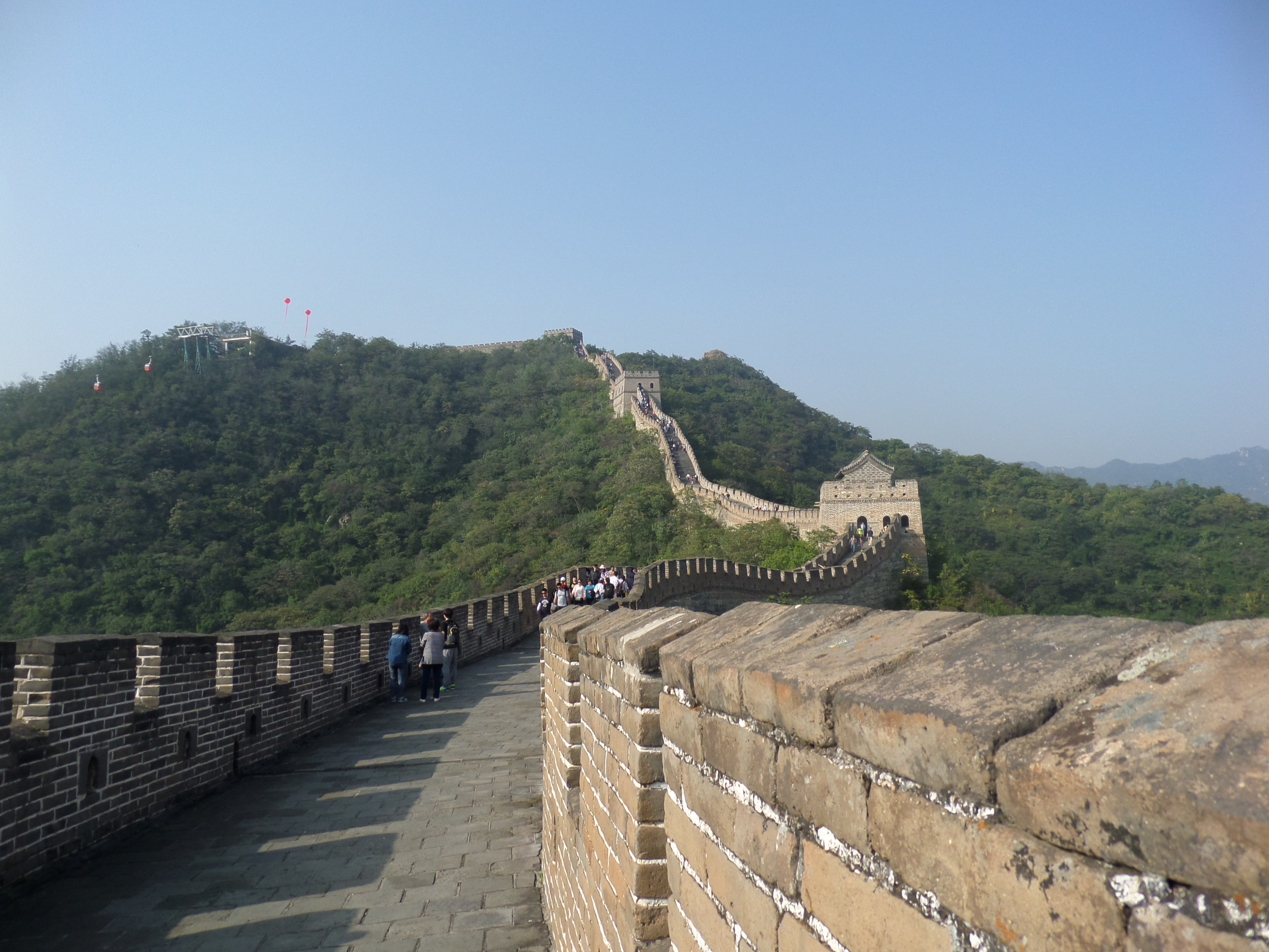 Kinesiska muren är ett byggnadsverk som byggt under olika kejsardynastier, från och till i 2 000 år. Den del jag besökte byggdes under Mingdynastin som regerade under år 1368-1644. Åtta meter hög och sju meter bred sträcker den sig kilometer för kilometer genom landskapet på bergstopparna. Säkerhet på byggarbetsplatsen var knappast något prioriterat, för det sägs att tre man dog per meter byggd mur. Den exakta siffran för hur lång muren är finns inte, men som mest pratar man om 10 000 kilometer.