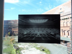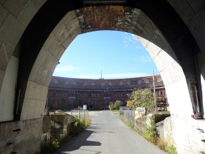 Rundvandringen i den halvfärdiga kongresshallen slutar så man kan se ut i själva den stora anläggningen. Svårt att inte bli imponerad över en byggnad som skulle byggas för 60 000 besökare och alla skulle kunna se Führern där han står i centrum.