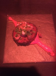 Första rätten var en bouillabaisse. Till denna drack jag bubblet. Ett bubbel som också funkade till andra rätten, en råbiff. En god lite rätt. Kan ha varit mina smaklökar som skojade till det, men jag tyckte det fanns en angenäm smak av fisk.