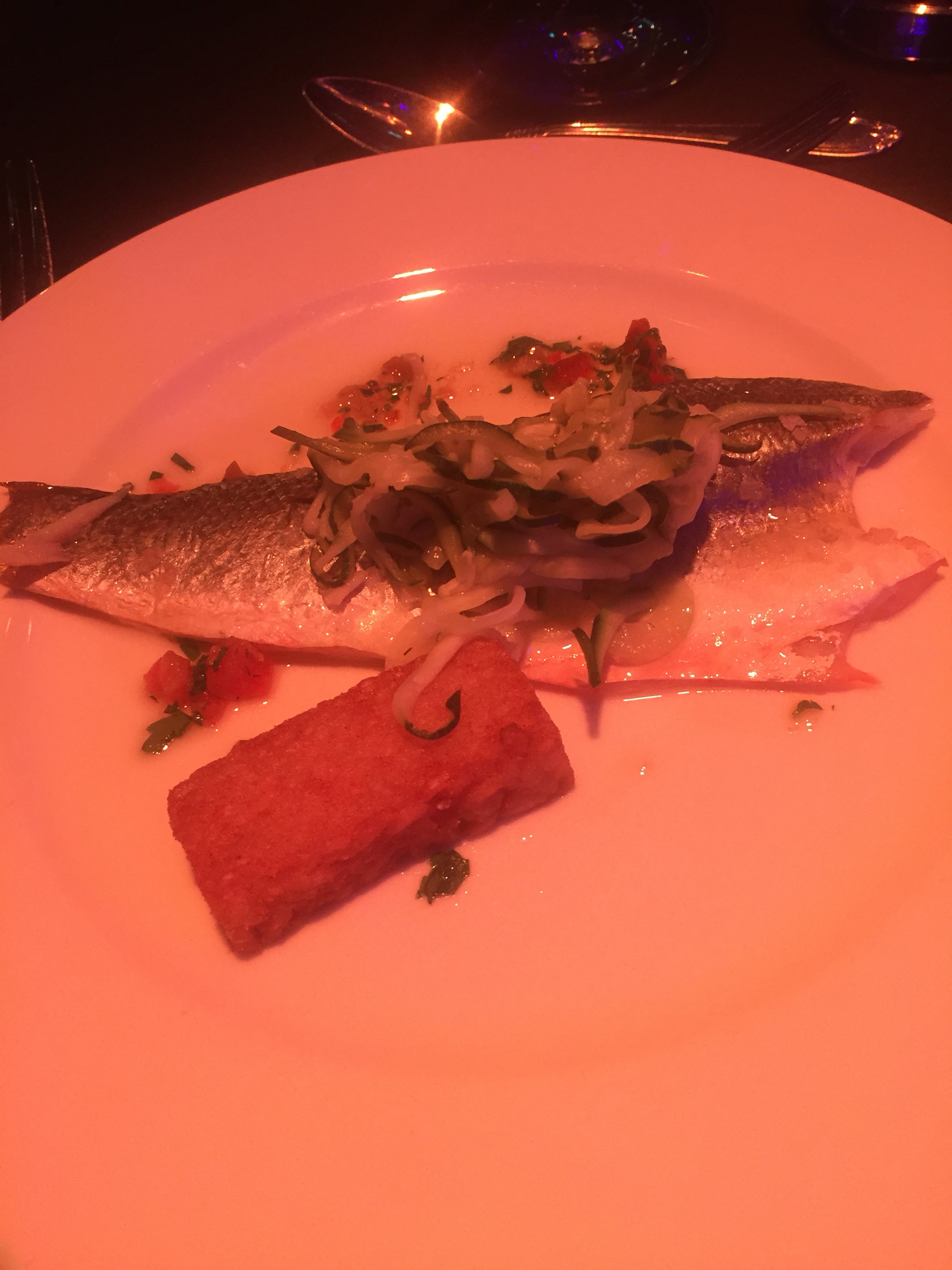 Det vita vinet kom in och till det serverades första huvudrätten. Havsabborre med zucchini och en friterad risotto bjöds det på.