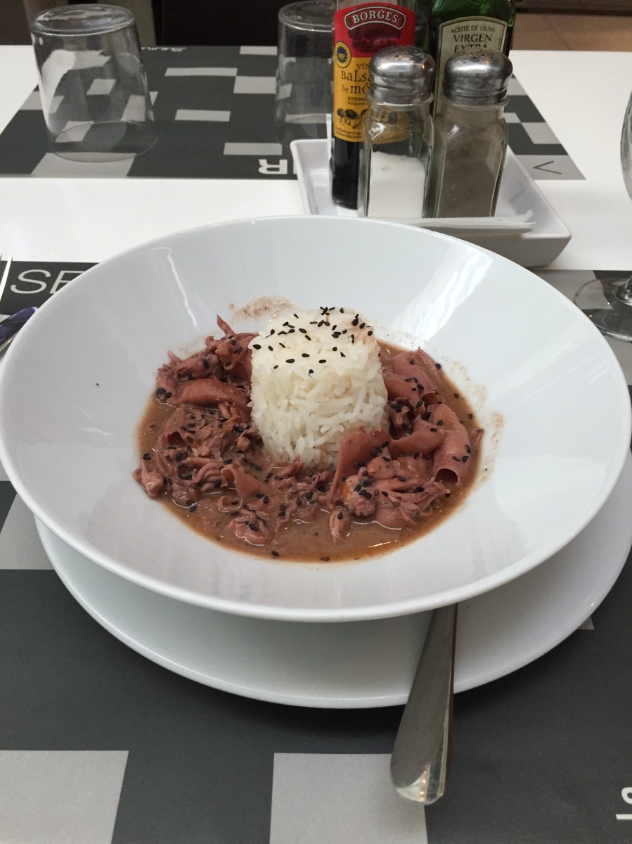 Huvudrätten bestod av små bläckfiskar och ris