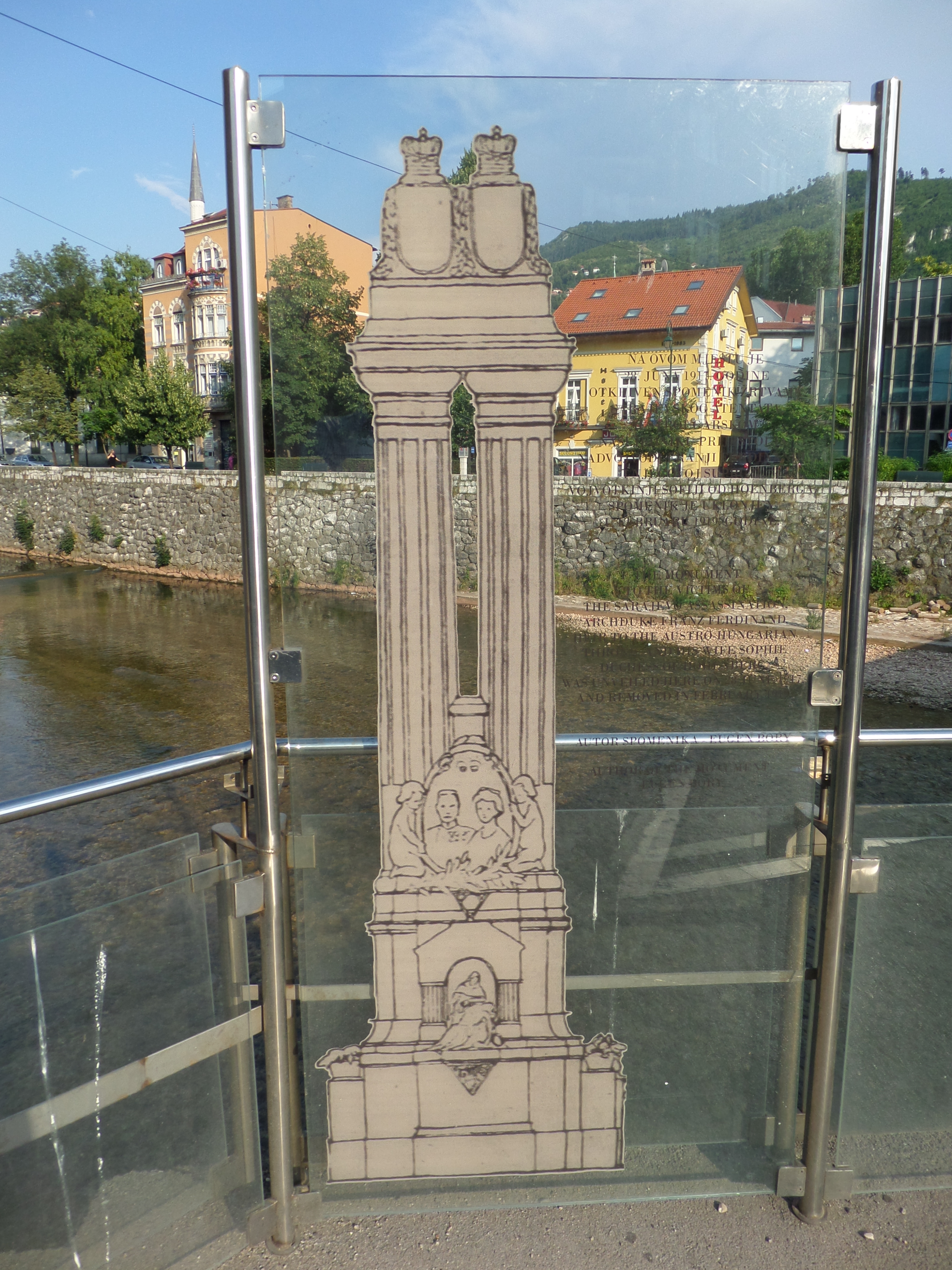 Sarajevo ← Föregående Nästa → Minnesplakett över ett monument som inte finns mer. Ett monument över den mördade ärkehertigen och hans gemål.