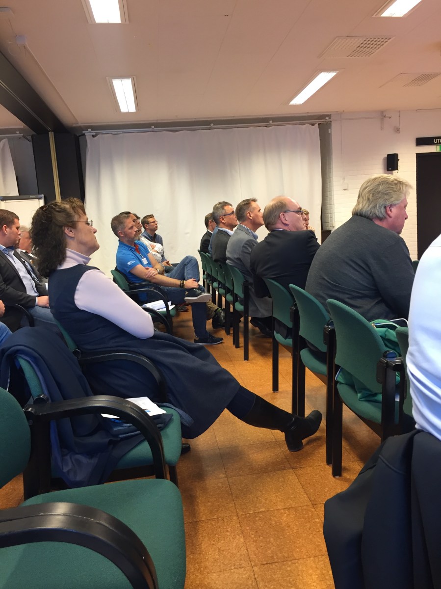 Åhörarna lyssnar spänt under Byggmästareföreningens möte
