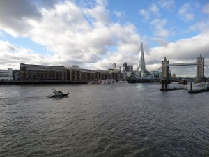 Även om besöket var i mitten av januari var det bra väder att vara ute och gå i. Solen sken men så klart var det kyligt i luften. Bra väder att vara ute och gå i och titta på staden. Trevligt är det också att längs med floden Themsen så finns det rejäla gångvägar. Dessutom finns det broar med jämna mellanrum, vilket gör att det blir naturliga etappmål för vandringen. Tower Bridge blev ett naturligt etappmål och övergång.