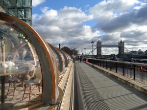 - Solen skiner på norrsidan av Themsen. Uteservering inne i glaskupolerna.