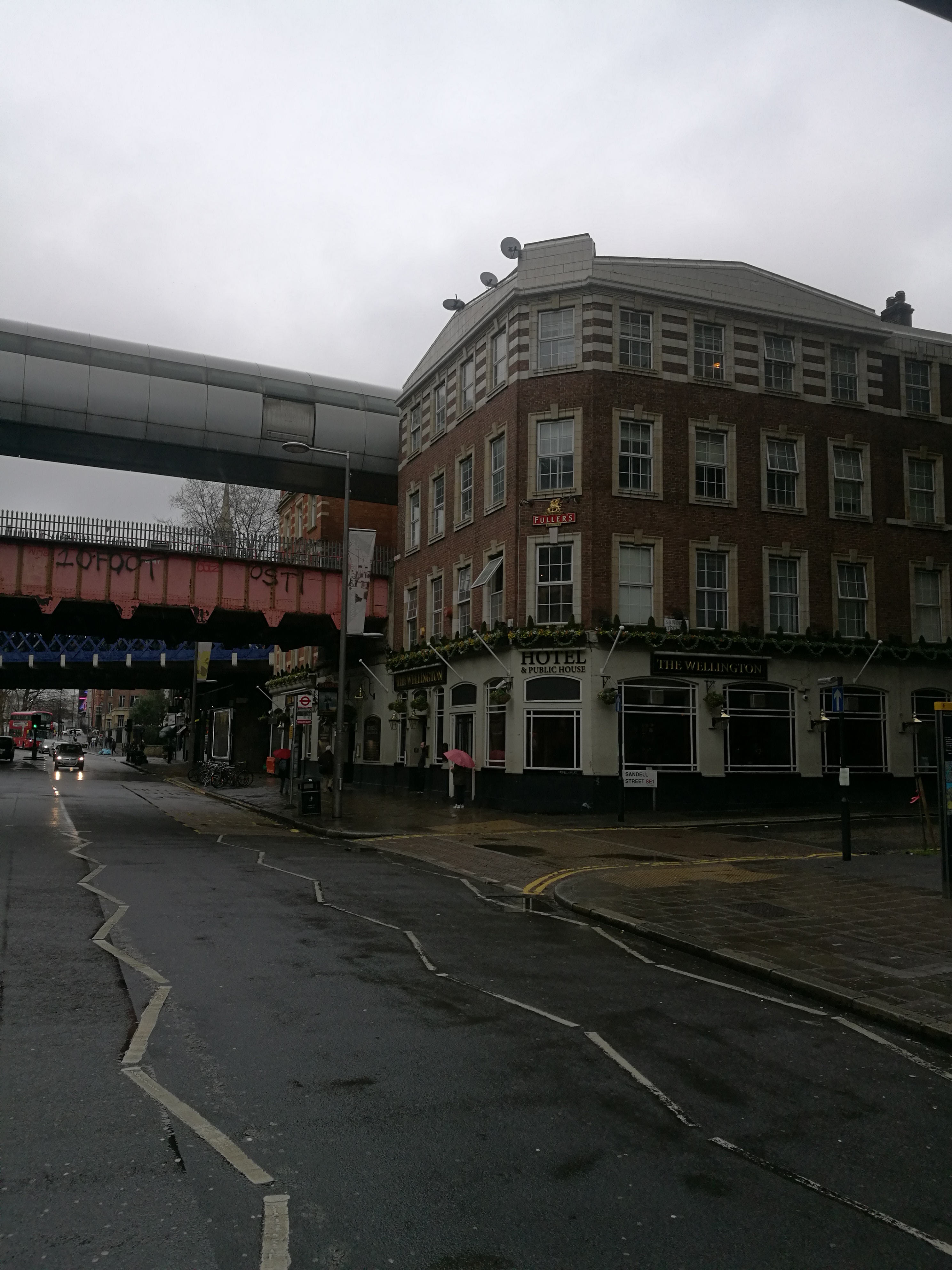 The Wellington Hotel, omgärdad av infrastruktur och pub på bottenplan