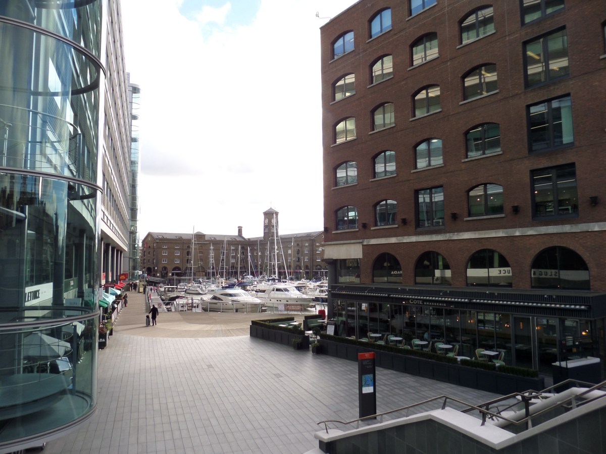 Bakom höga hus dyker St. Katharine Docks upp