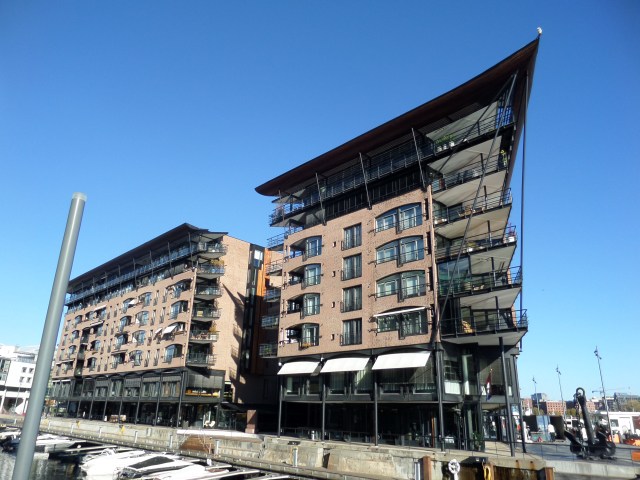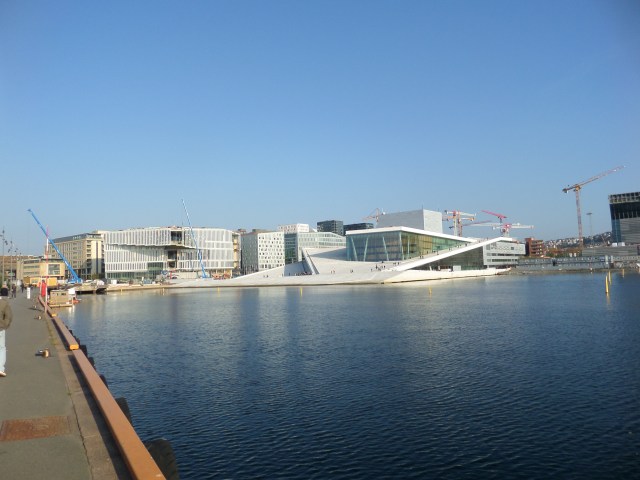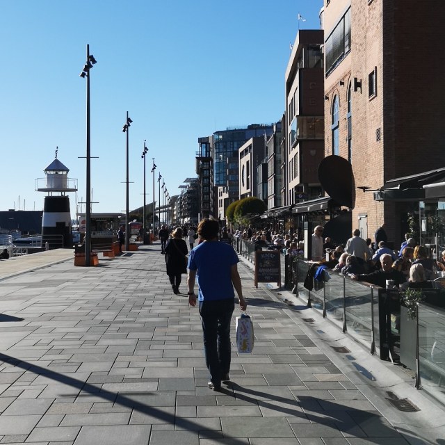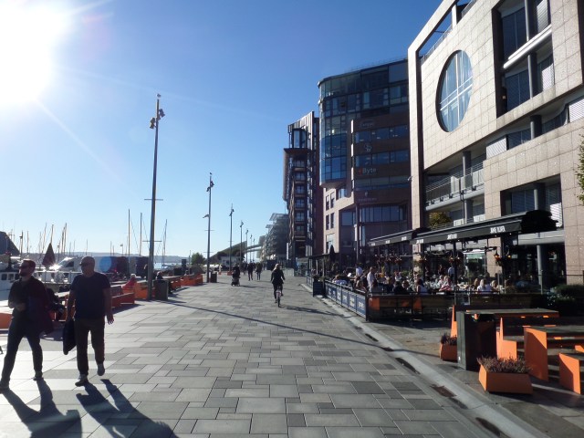 Det är trevligt att vandra längs med Akers brygge i solskenet. En relativt nybyggd stadsdel. Det blev middag på kvällen här, på en av uteserveringarna. Förvisso var det ljummet i luften men infravärmen gjorde det riktigt trevligt. Maten var dessutom god.