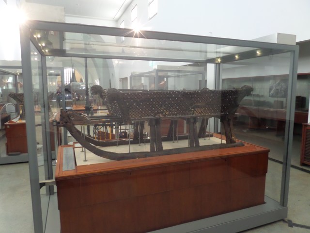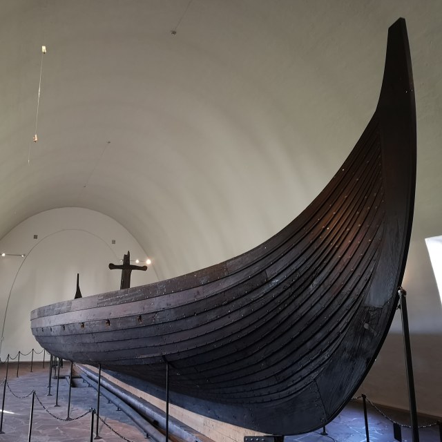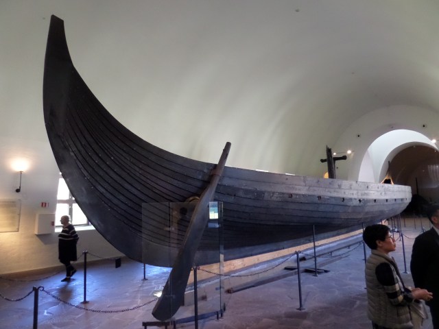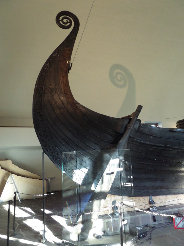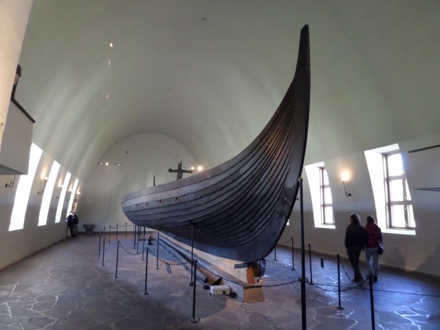 Det är något speciellt med att stå en knapp meter från ett skepp byggt för tusen år sedan. Osebergsskeppet, byggt i ek på vikingatiden är 21,5 meter långt och 5,1 meter brett. Det upptäcktes 1903 och grävdes ut 1904-05. Detta är det mest välbevarade skeppet från vikingatiden. Dessutom väldigt fyndrikt. Bakgrunden till det är att skeppet upptäcktes i en gravhög över två kvinnor. Förutom själva skeppet fann man rikt utsmyckad vagn, släde, stolar och många andra föremål som kunde vara bra att ha med sig i livet efter detta.