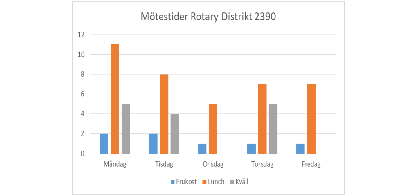 När jag gjorde denna enkla sammanställning kan jag konstatera att vi gillar att träffas i början av veckan. Vårt distrikt består av 59 klubbar från Trelleborg i söder till Höganäs i norr och Kivik i öster. Mer än hälften av klubbarna har haft sina möten när två av arbetsveckans fem dagar är avverkade. Måndagen är helt klart den mest populära veckodagen för möten i Rotary i vårt distrikt. Lunch är det som är mest vanligt att vi träffas över. 64 % av klubbarnas möten är lunchmöten.