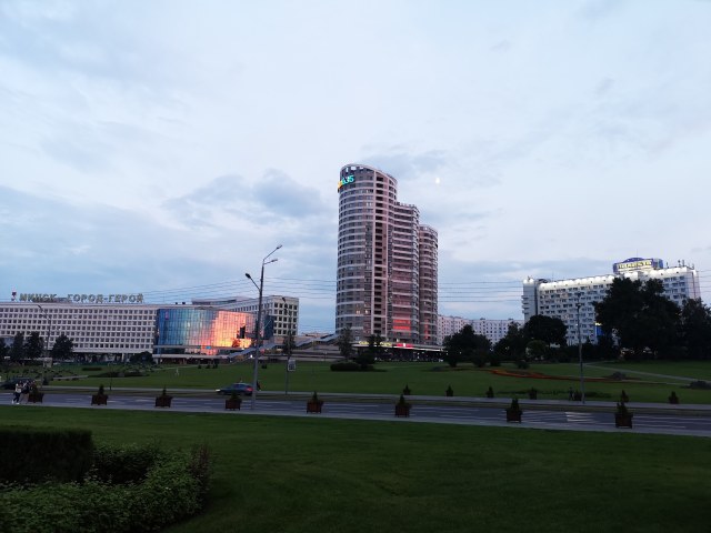 Väl framme på hotellet i Minsk var det slut på missöden. Ett trevligt tämligen modernt hotell belagt i de centrala delarna av stan. Skön säng, bra badrum, väldigt bra wifi och ett kallt rum i den varma sommaren kändes som en bra bas för att upptäcka stan. En första tur begav jag mig ut på stan för att se mig runt omkring denna varma julikväll.