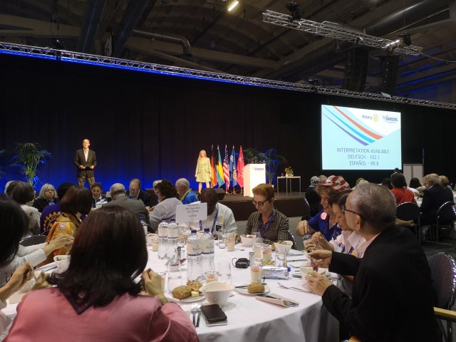 Onsdagens lunch var tillägnad världens alla Rotaryklubbar. Denna gång lyckades jag hamna, tack vare fri placering, vid bordet som förre svenske världspresidenten Carl-Wilhelm Stenhammar var värd för. Tyvärr fick vi inte möjlighet att prata så mycket. Övriga runt bordet var från Schweiz, Tyskland, Filipinerna (tror jag), Sverige och USA.