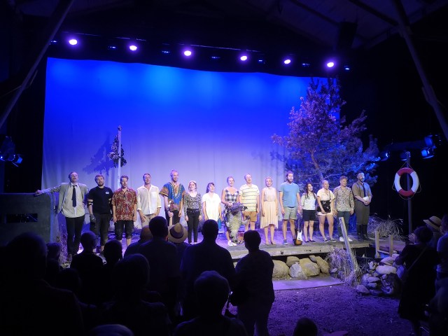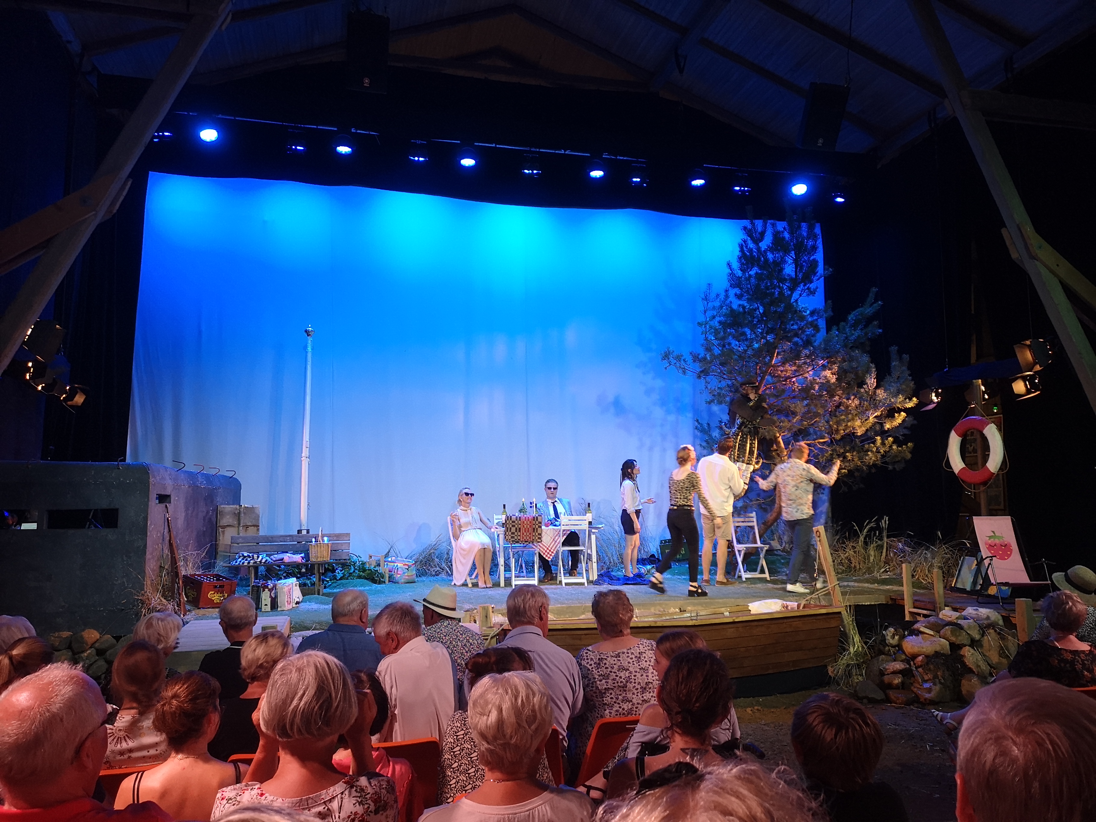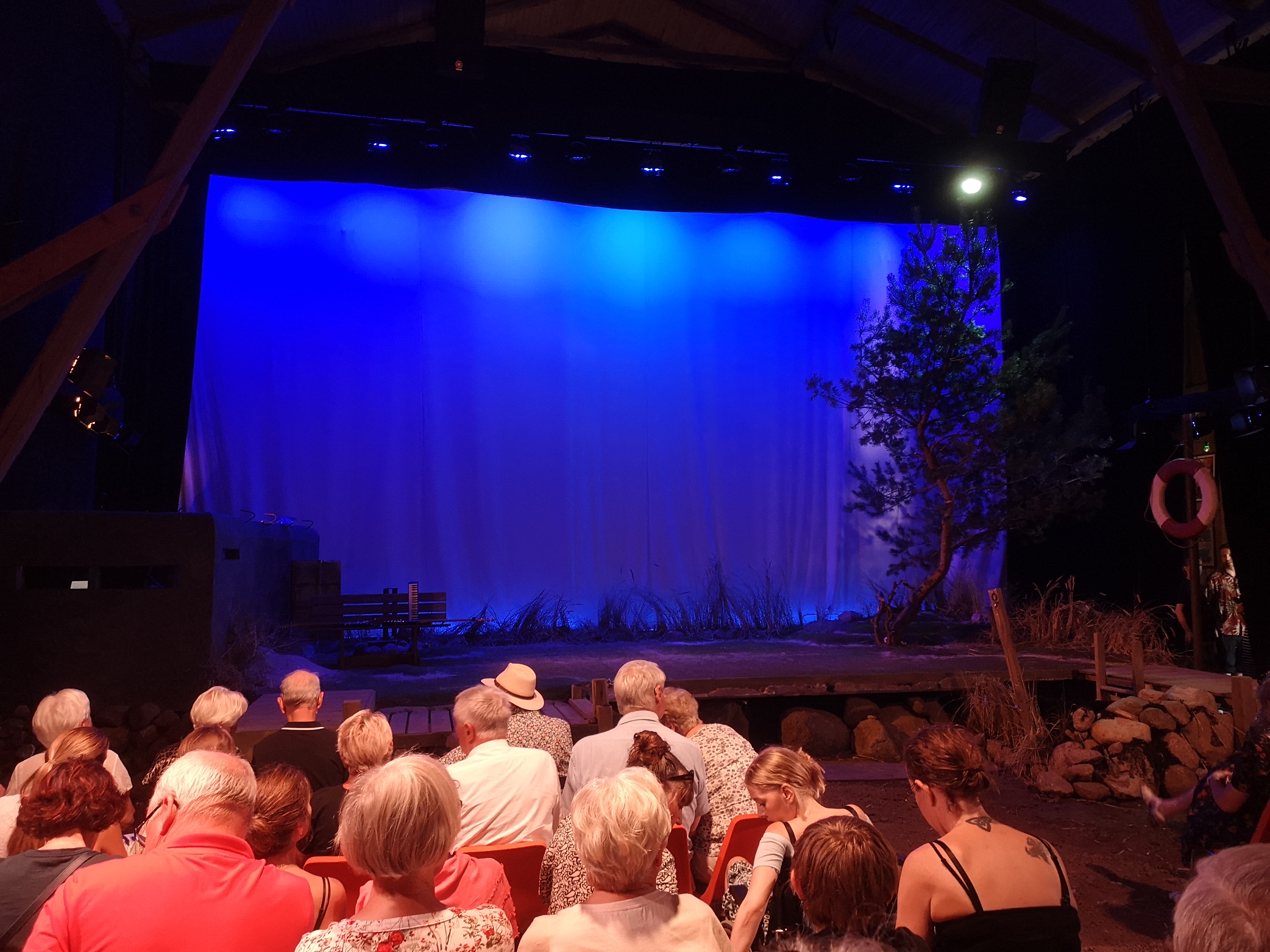 Jag är en varm anhängare av dekor. Det är oftast detaljerna som gör helheten, men ibland behövs en helhet också. Detaljerna är många och snyggt gjorda. En tall på scen. En bunker där orkestern sitter i. Flaggstången från första akten blir en midsommarstång i andra akten. En av de två entréerna in i teatersalongen är på en trägång, en brygga. Bara att det finns vatten för Olle att hoppa ner i, så det stänker, visar på ett genomgripande tänk.