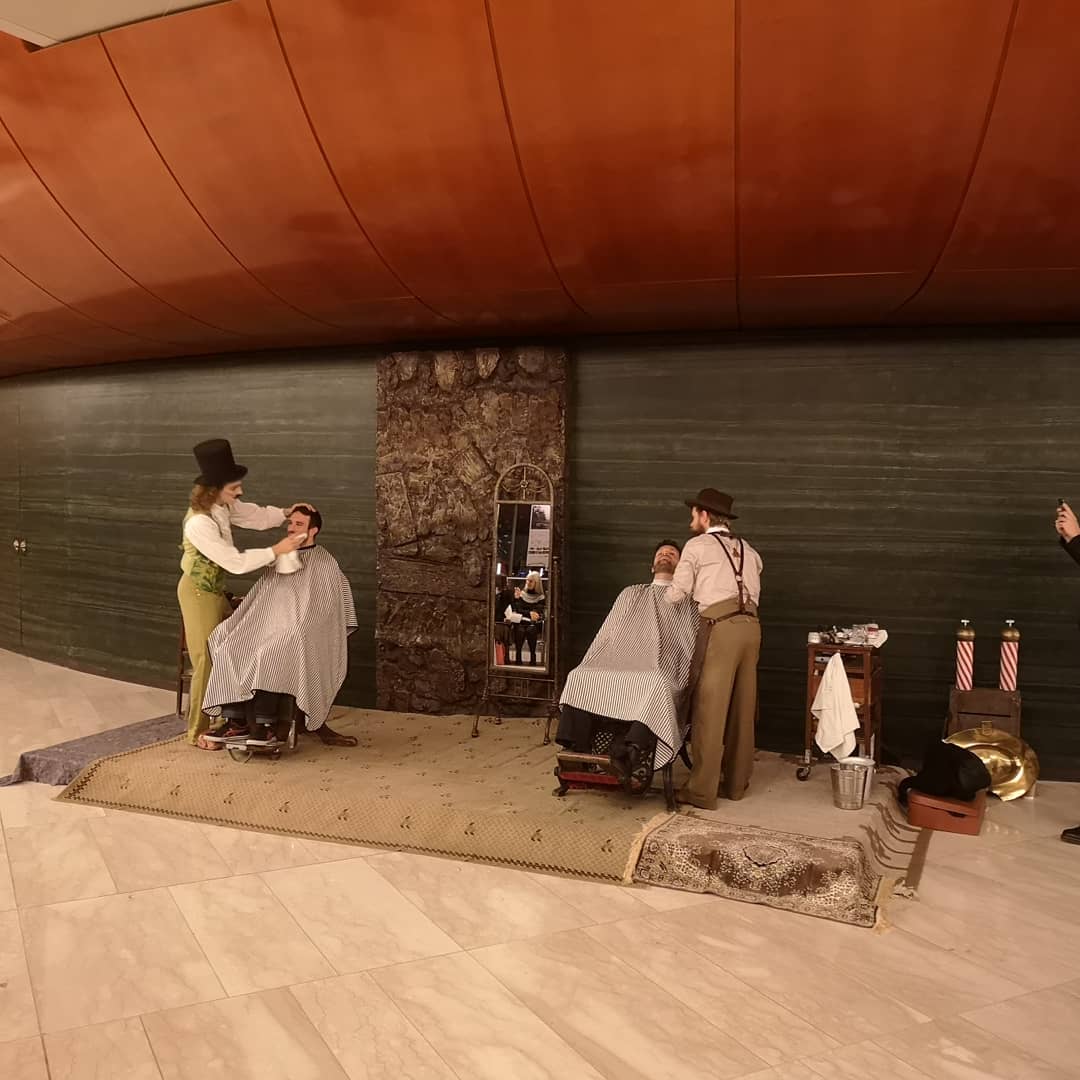 Musikal ← Föregående Nästa → Någon som vågar bli rakad före föreställningen? Två barberare finns i foajén före föreställningen med tidstypisk klädsel