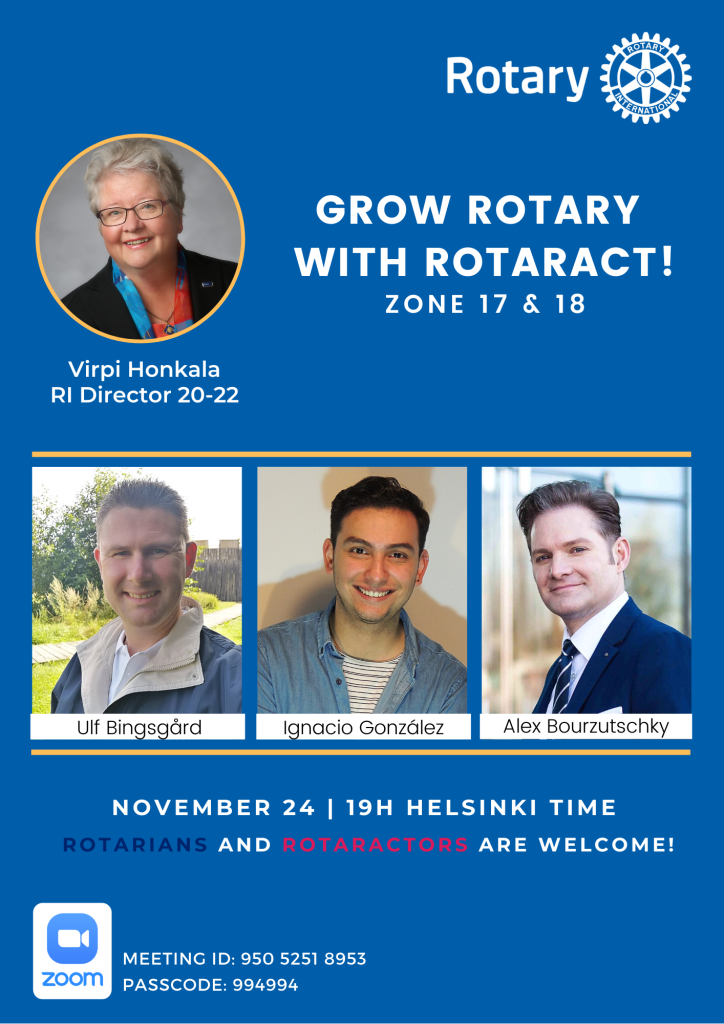 Jag är väldigt glad över att jag valde att åka till Oulu. I tider som dessa var det inte en självklarhet. Vi behövde ha intyg som visade på att vår resa till Finland var viktig. Jag fick visa upp det innan jag skulle checka in mig på flyget, innan jag klev på planen och vid gränskontrollen i Helsingfors för att bli insläppt i landet. En resa som däremot inte blev av var den planerade resan till Honolulu, Hawaii, och årets Convention. Convention blev en digital upplevelse istället. Så klart är det inte samma sak som att vara tillsammans med 20-25 000 andra rotarianer från hela världen, men digitala möten ger andra möjligheter. En sådan möjlighet blev när jag tog initiativet tillsammans med en god vän, en rotaractare från Chile, Ignacio och ledamoten av Rotary International styrelse, zone director Virpi. Vi skapade ett digitalt möte för rotarianer och rotaractare i zonerna 17 och 18 kring ”Grow Rotary with Rotaract” kring hur vi tillsammans kan jobba för att få fler engagerade i vår organisation. En träff som fick drygt 60 deltagare från de olika länderna i zonerna.