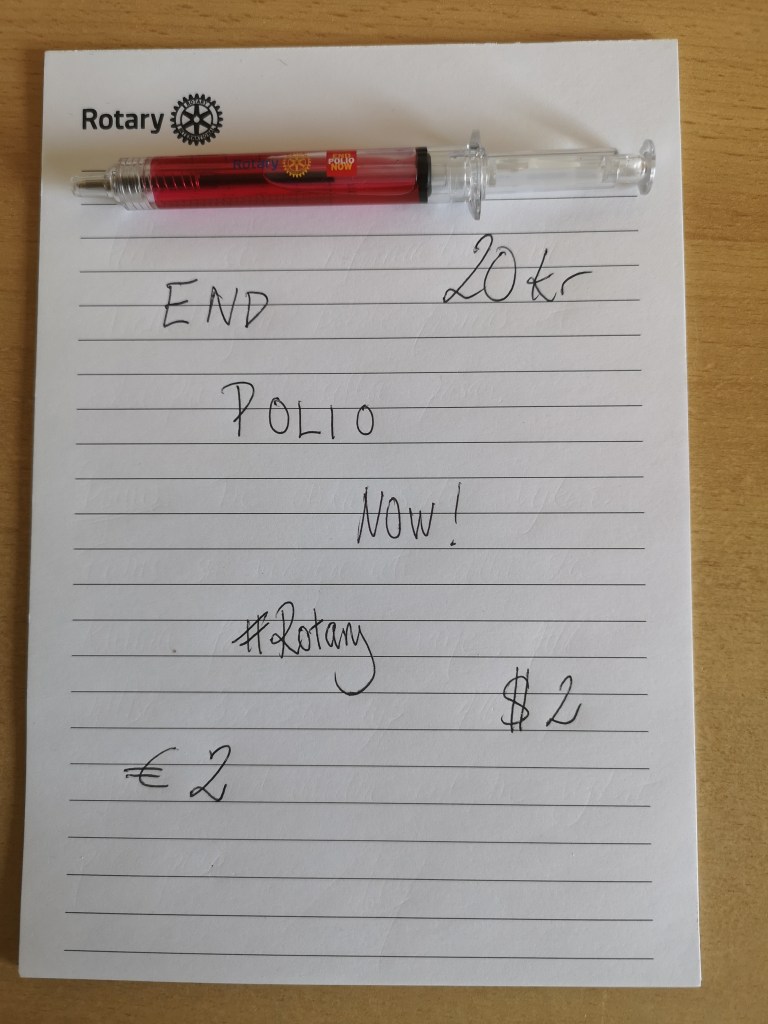 Det finns också EndPolioNow-pennor och EndPolioNow-halsdukar om så skulle behövas. En halsduk kostar 150 kr/st och då går 50 kronor till kampen mot polio. En penna kostar 20 kr/st och då går lite mer än 10 kronor till kampen mot polio.