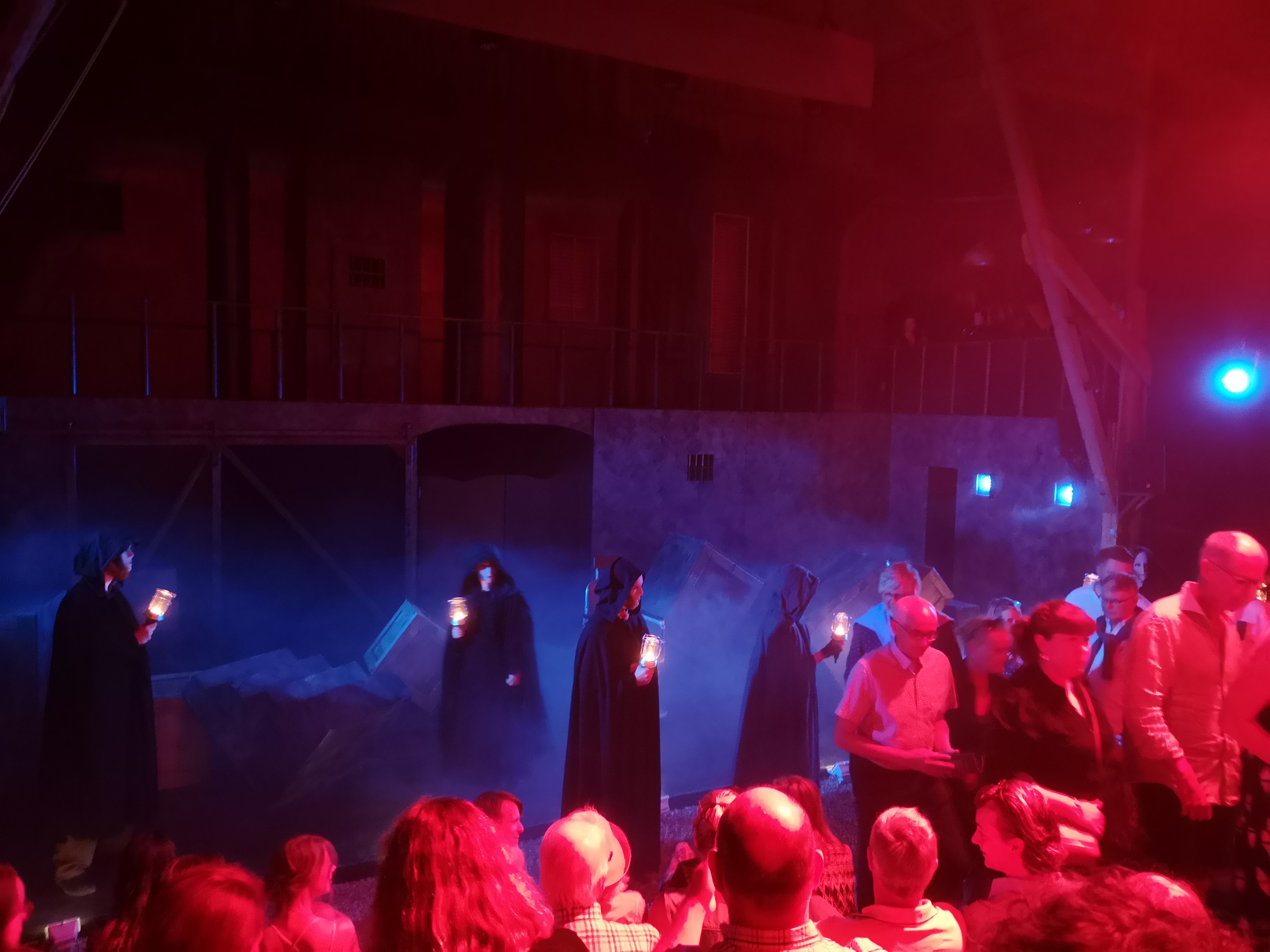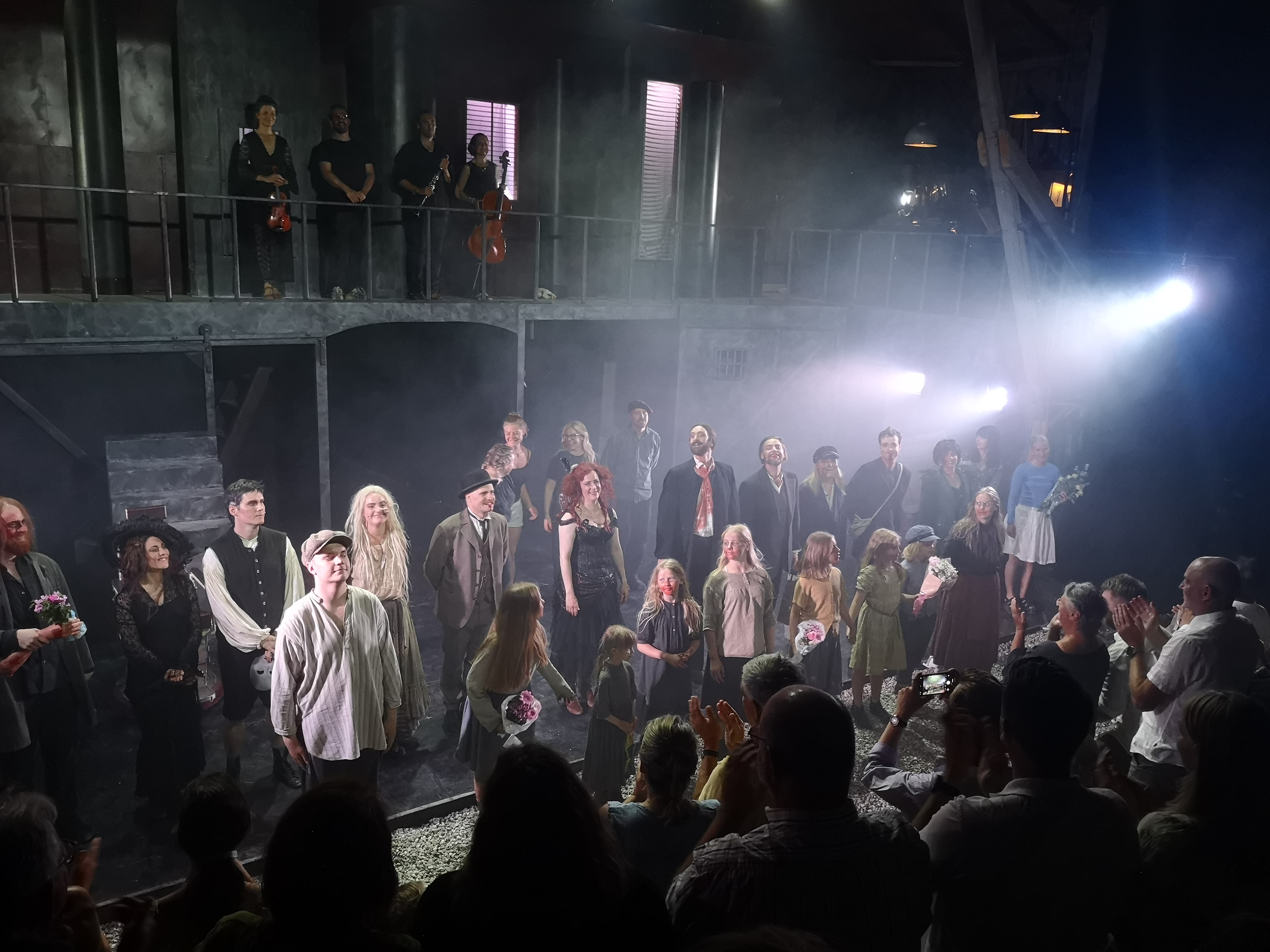 Det skapas små rum och utrymmen på scen så att man förstår att man är på olika platser. Det är alltid utmaningen med en statisk scen att ändå kunna visa på de olika rummen och platserna där saker och ting utspelar sig. Tycker att man gör det på ett bra sätt. De väljer också att använda publikgången som spelyta vilket gör att skådespelarna kommer nära publiken. Det händer saker inte bara på scen utan också ute bland publiken, ibland med tilltal till publiken, som skapar en närhetskänsla. Även om vi som publik bara tittar på och inte förväntas göra något, så är vi ändå en del av helheten. Musikalen spelas både för oss och med oss.
