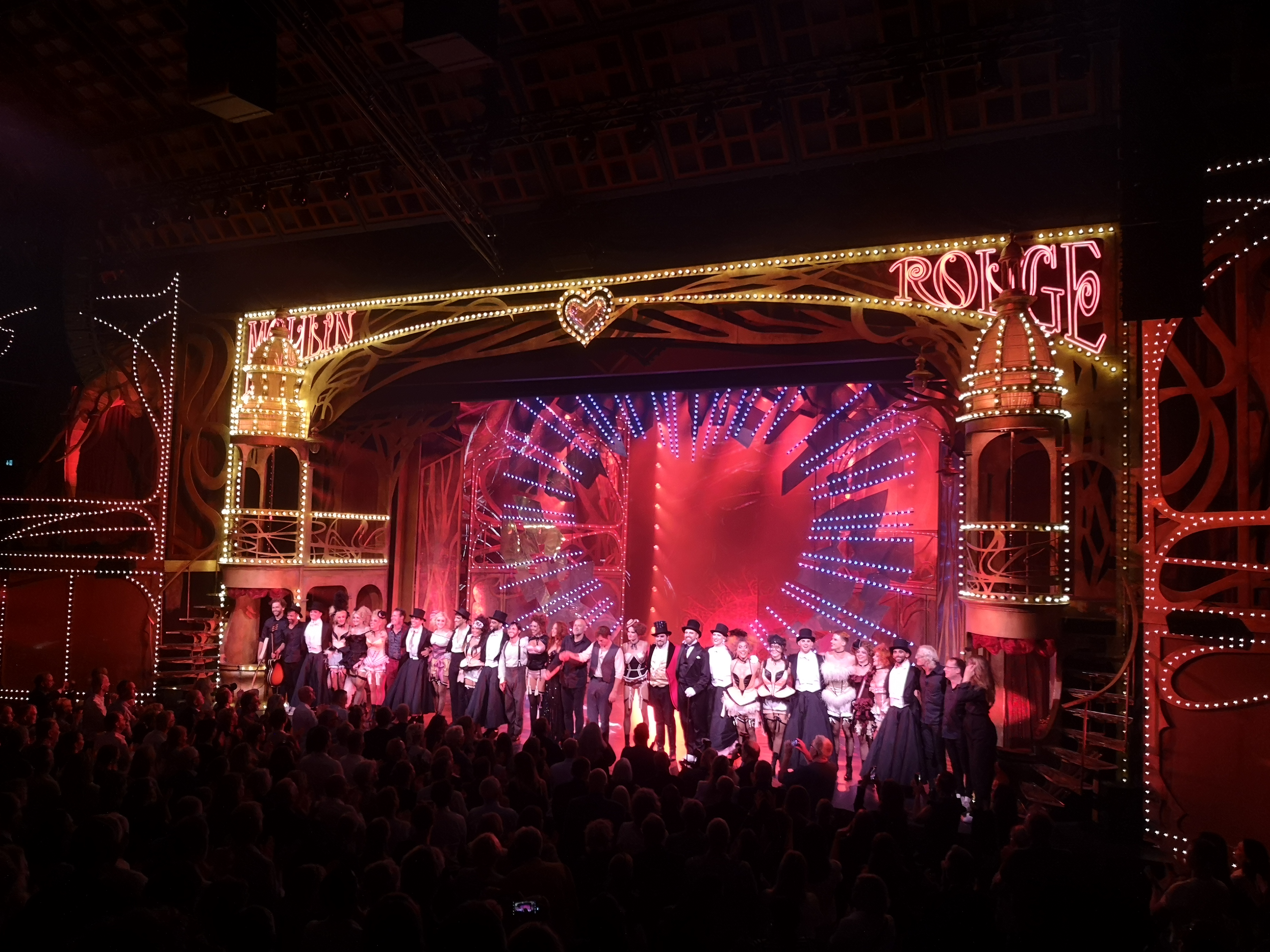 Mina referensramar inledningsvis är onekligen teatern i London som verkligen blivit Moulin Rouge, hela vägen ut från entrén in på platsen i salongen. Det gör att scenen i Köpenhamn blev lite platt, för det var en helt vanlig teaterscen. I London drogs vi som publik in i föreställningen lite mer, som om vi var på en nattklubb istället för på en teater. Med det sagt, så får jag ändå säga att även om scenen blev vanlig och ”platt” fanns det flärdinslag som gjorde att känslan av Moulin Rouge fanns där.