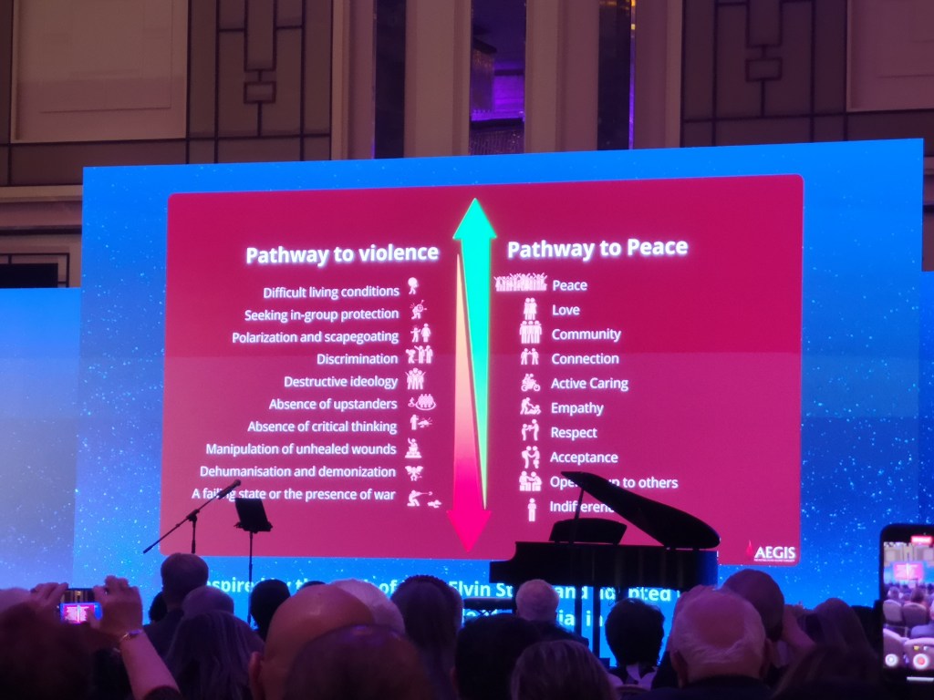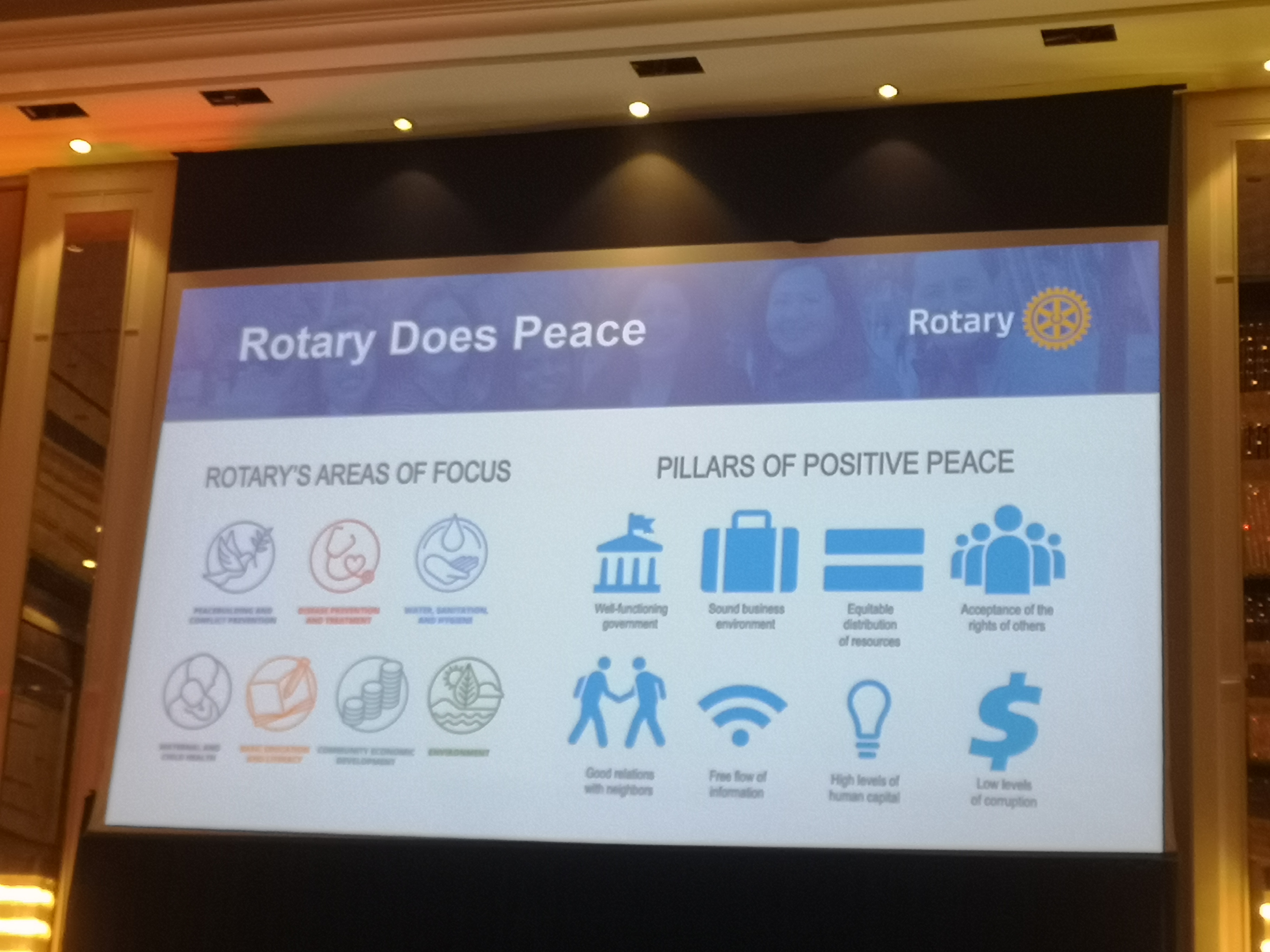 Det var onekligen många och svåra utmaningar som målades upp. Men, det gavs också hopp. Hopp kring hur fredliga lösningar kan finnas och vikten av att kunna förlåta. Tidigare presidenten för Rotary International Ravi Ravindran berättade om hur eldupphör kunde förhandlas fram på Sri Lanka för att vaccinera mot polio. Vi fick även höra Freddy Mutanguha, chef för Kigali Genocide Memorial, ge sin gripande och personliga berättelse kring folkmorden i Rwanda, både bakgrunden och hur man nu går vidare för att läka landet.