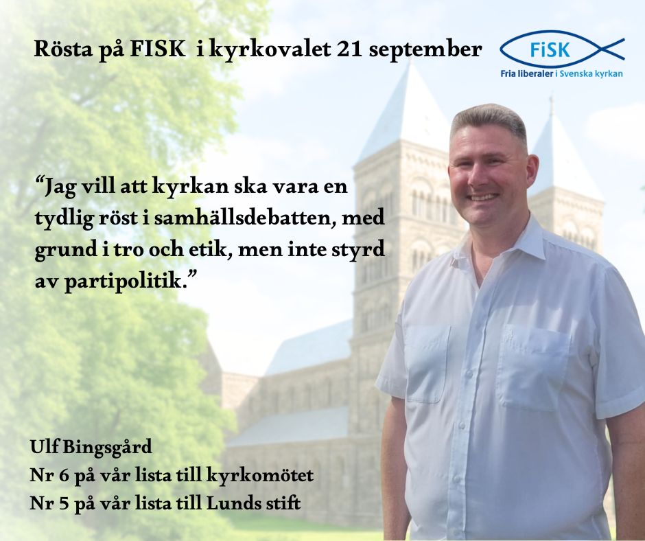Jag, Ulf Bingsgård, kandiderar för Fria liberaler i Svenska kyrkan (FiSK) i valet till stiftsfullmäktige i Lunds stift och till kyrkomötet i Uppsala i kyrkovalet den 8-21 september.