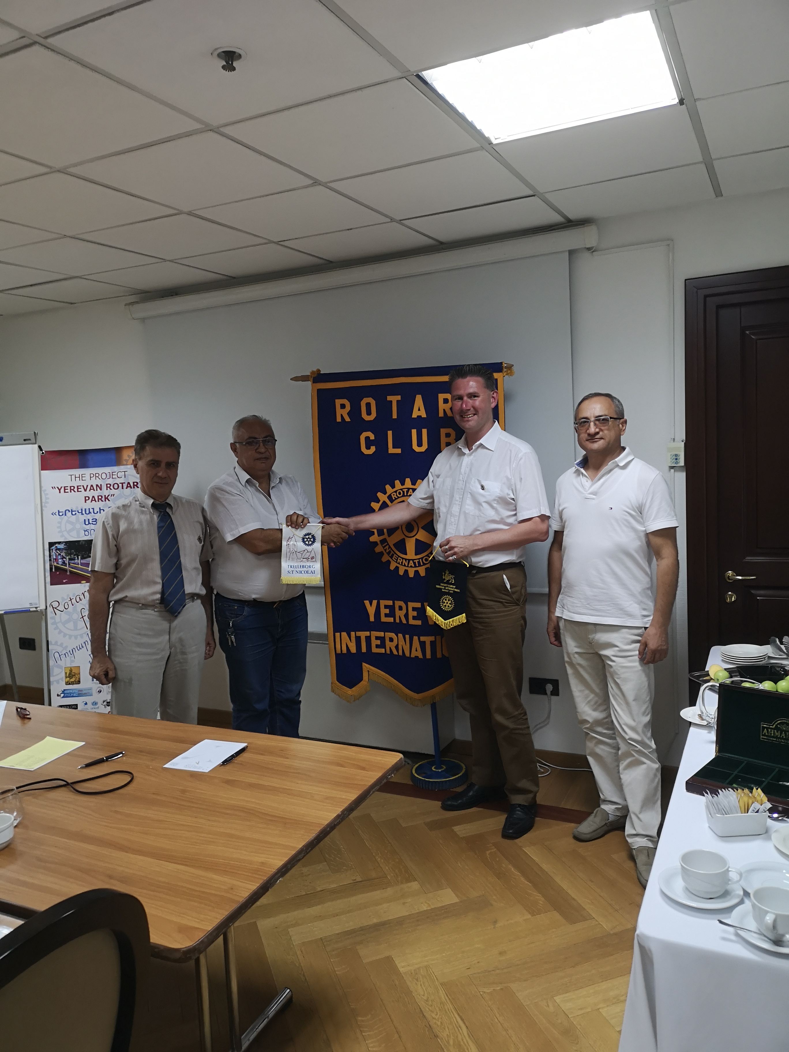 Rotary På besök i Yerevan-International Rotary Club. Jag och kvällens president utbyter klubbstandard.